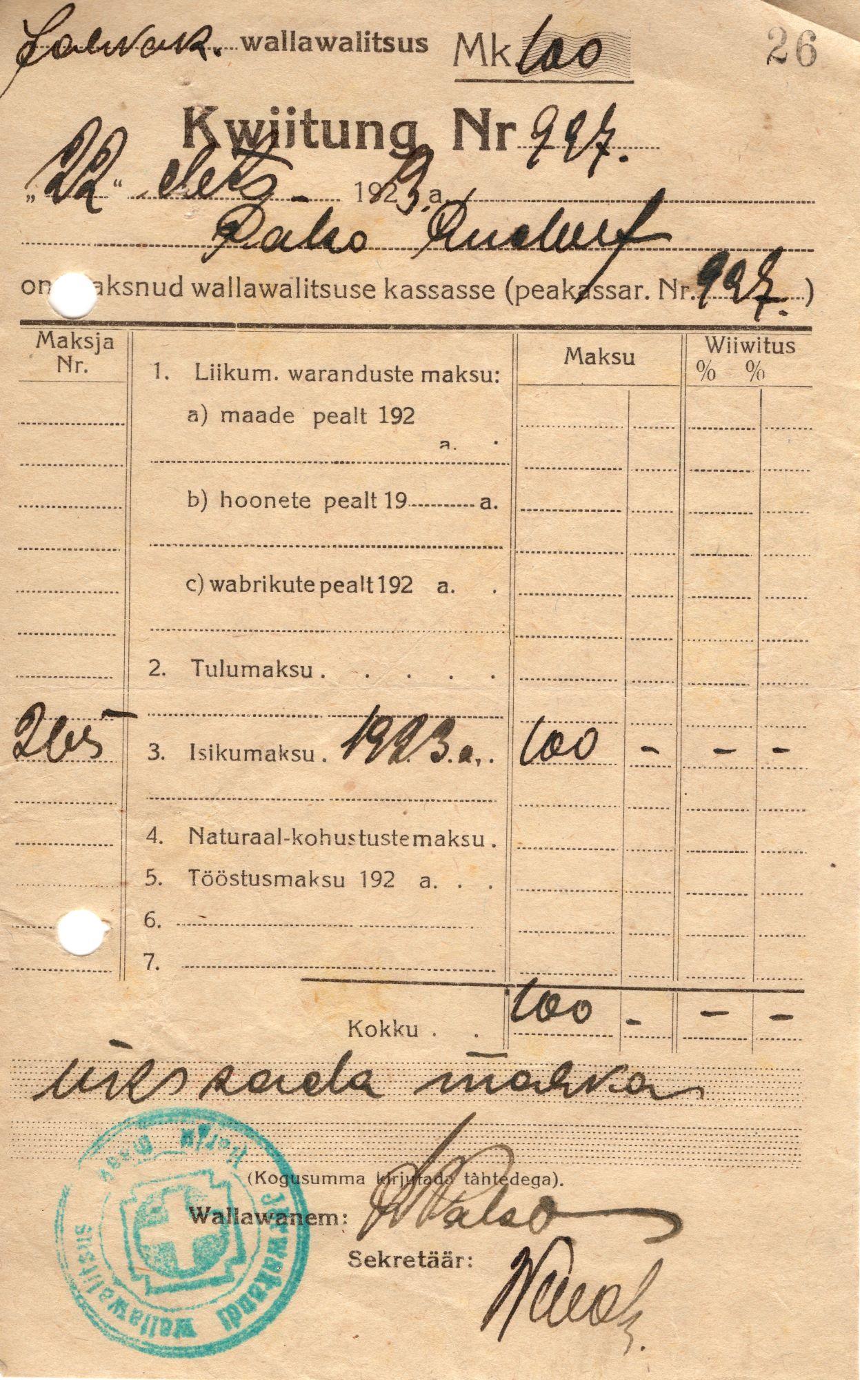 | dc.description | Kviitung isiku- ehk pearahamaksu tasumisest aastast 1923 suuruses 100 marka. | et_EE |