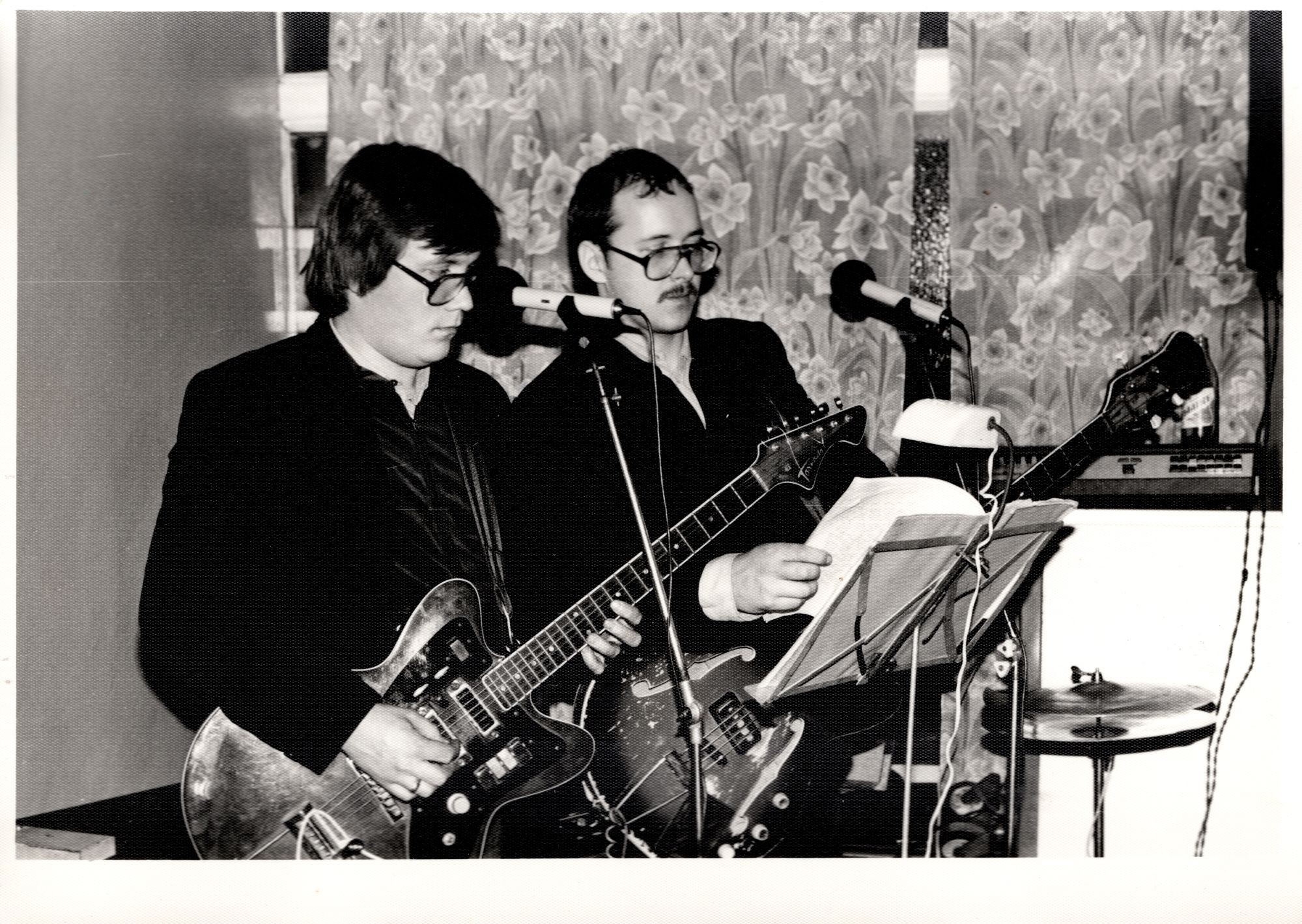 Rapla TTV III tsehhi nääripeol Alu sööklas. Esineb koondise "Eesti Põllumajandustehnika" Märjamaa osakonna kaheliikmeline ansambel "Umptsa". Fotol sama ettevõtte tehnoloog Meelis Kaljuma (paremal) ja Märjamaa Keskkooli õpetaja Aivar Jaago.