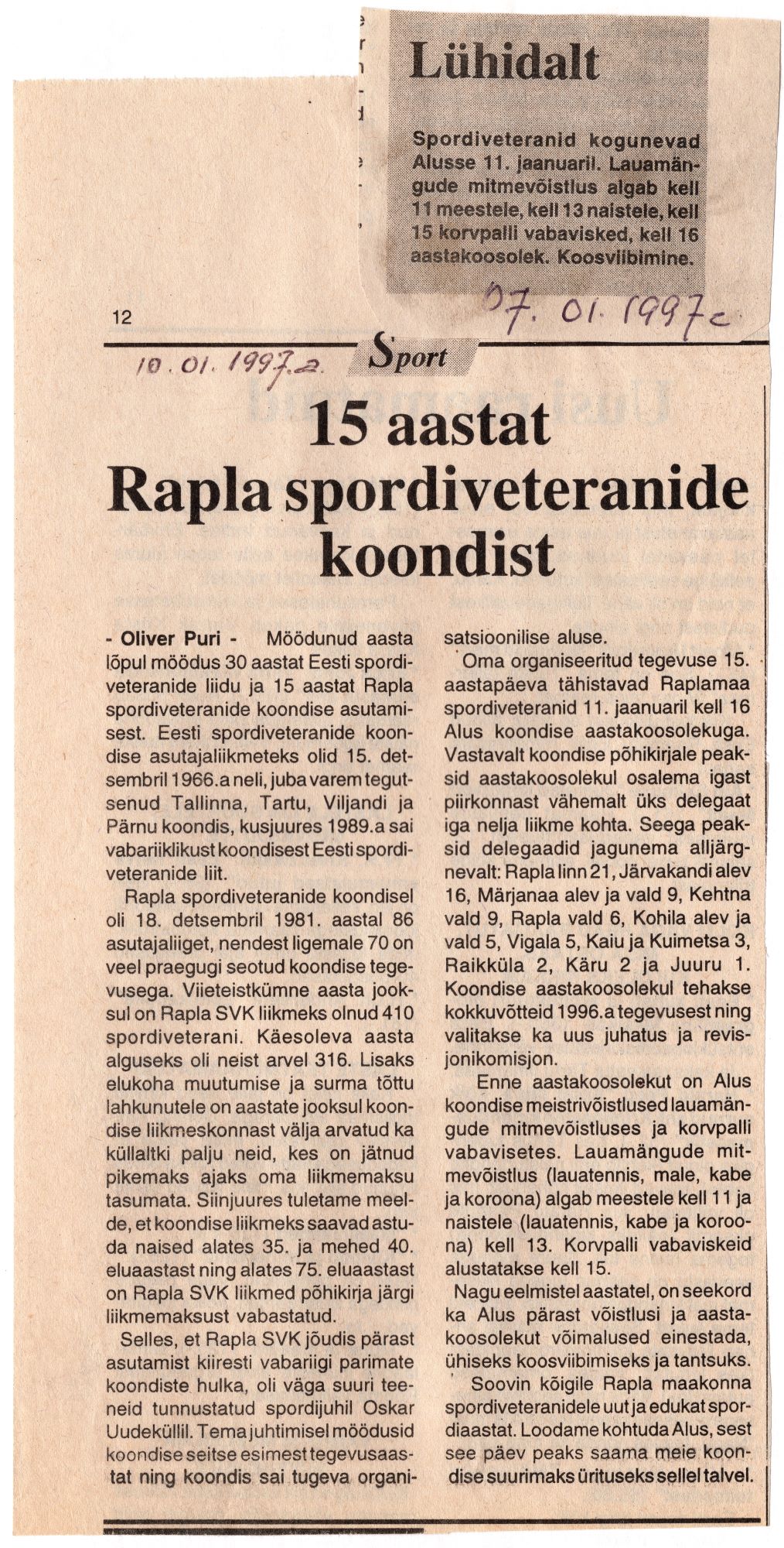 Raplamaa, spordiveteranid, artiklid, Rapla Spordiveteranide Koondis, tähtpäevad