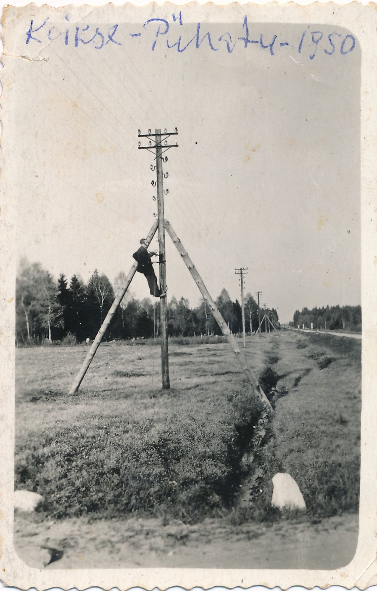 1. Voldemar Kamat tööl Koikse-Pühatu elektriliinil, 1950. Elektrimontööri tööd tegi Kamat sidesõlmes üle 30 aasta.