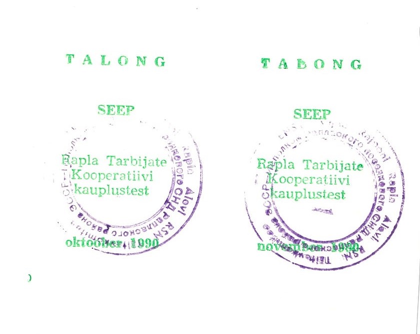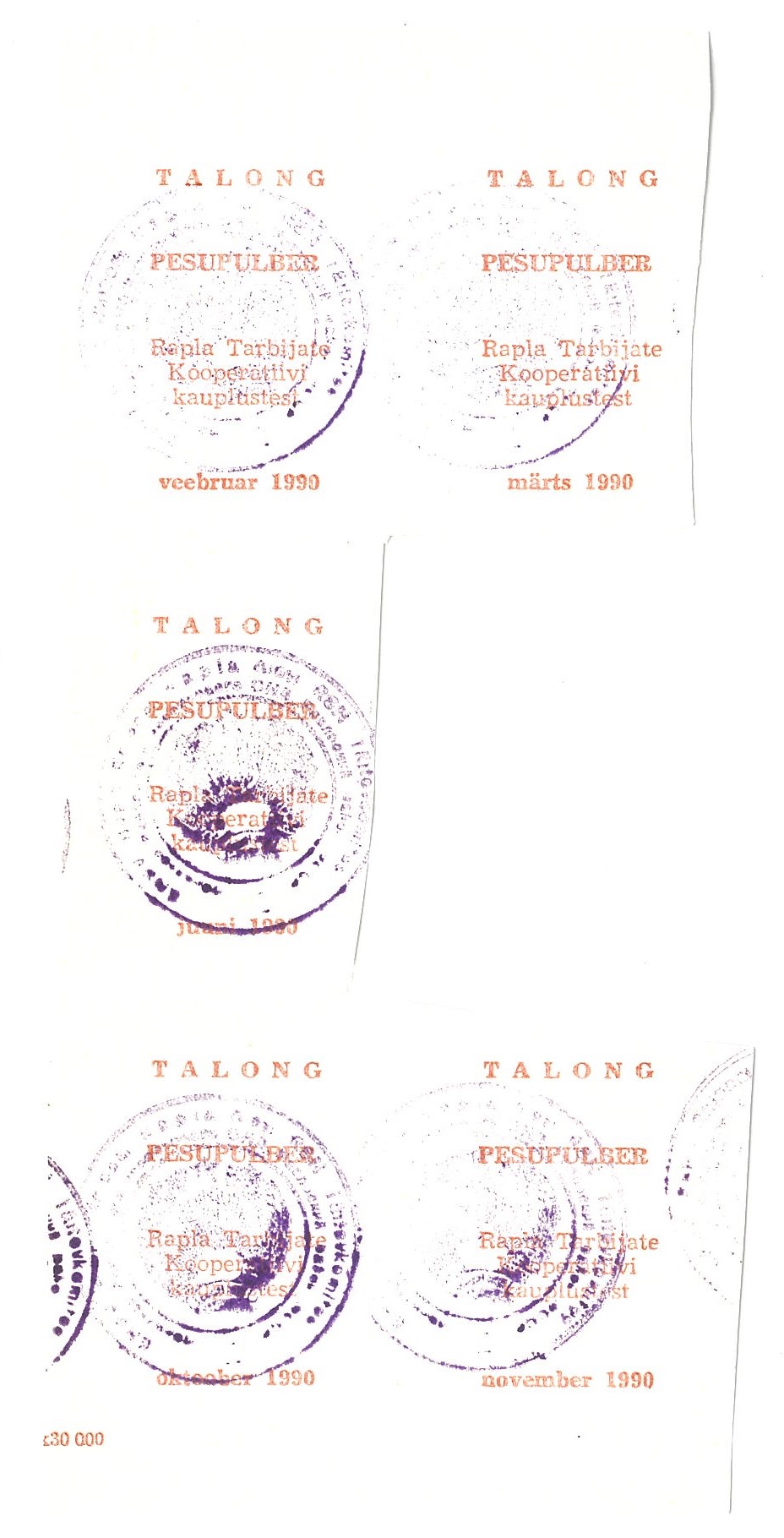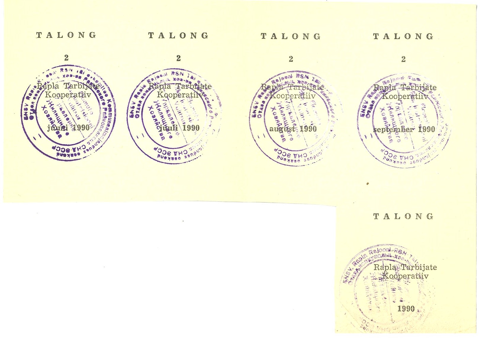 Kaubapuudus oli aastail 1989-1991 suur. Et kaupu jaguks enam-vähem võrdselt, eraldati inimestele ostutalongid. Olid olemas suhkru-, pesu-, viina-, seebi-, pesupulbri-, makaroni-, jahu- ja kõikvõimalike muude kaupade talongid. Piltidel Rapla Tarbijate Kooperatiivi 1990. aasta talongid seebi, pesupulbri ostmiseks. Talong nr 2 ilmselt alkoholi ostmiseks.