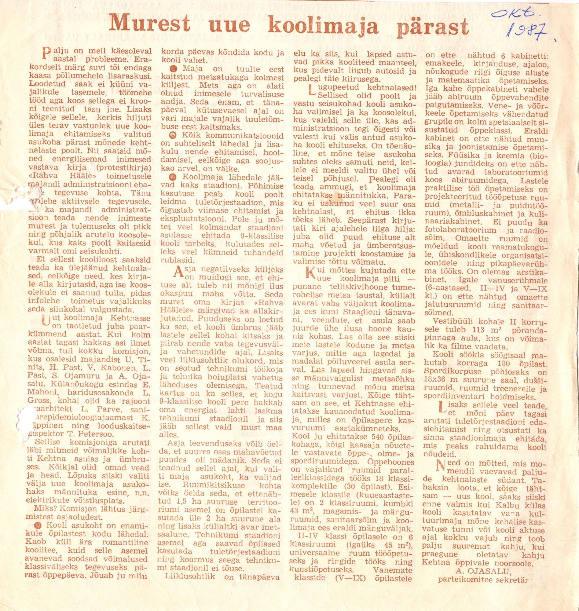Arnold Ojasalu artikkel Kehtna uue koolimaja ehitamisest.