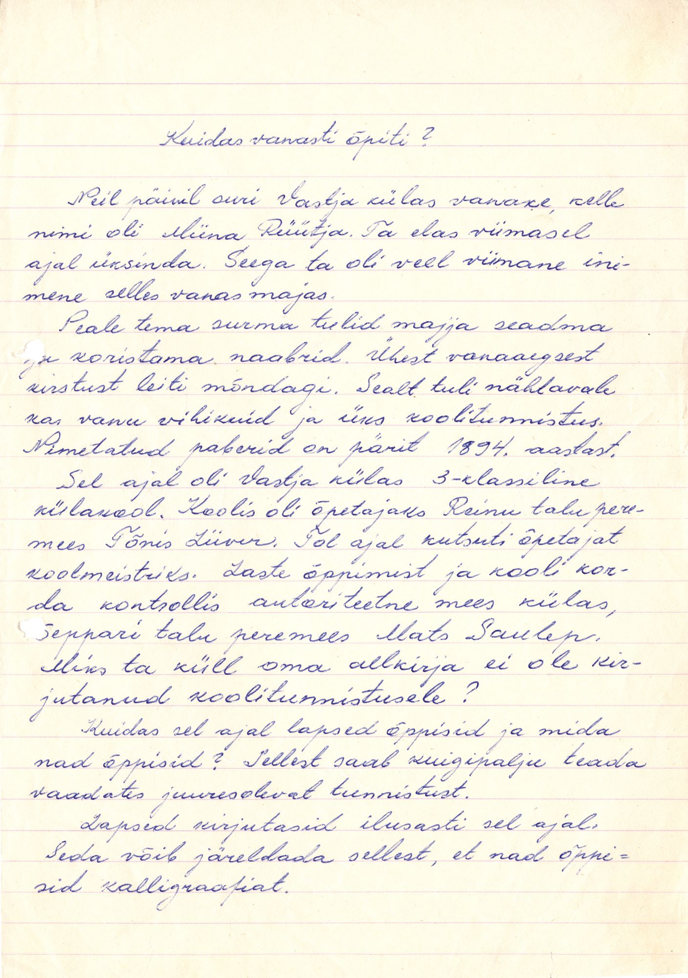 Mälestused Vastja koolist aastast 1894. Kirja pandud leitud paberite järgi.