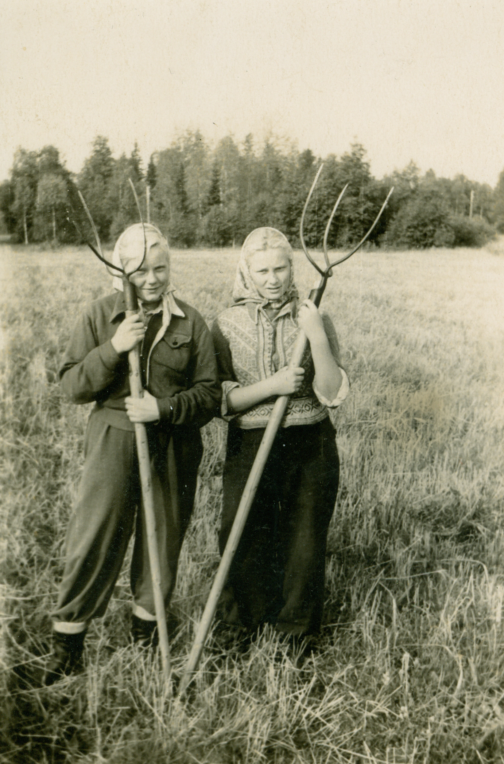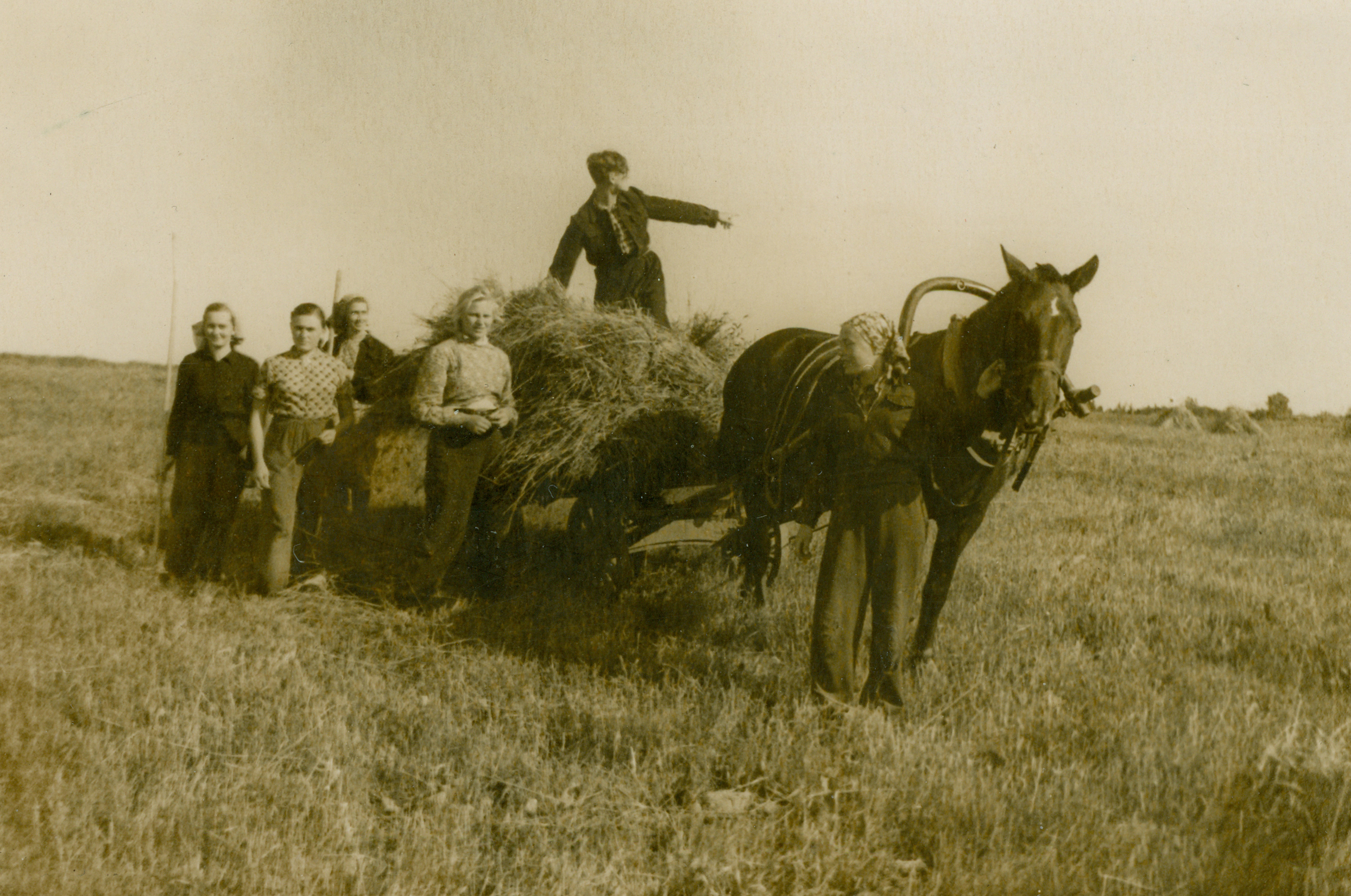 2. fotol Jaan Ehand koorma otsas, ees Milvi Reinberg, Kulla Kasenurm, Svetlana Soeson ja hobuse pea juures Liidia Tukkia;