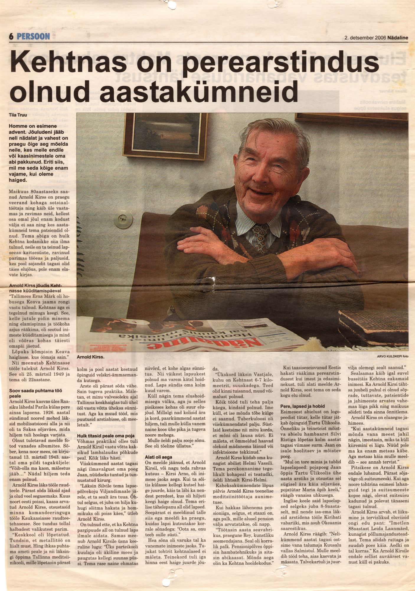 Artikkel 2006. a Nädalises rubriigis Persoon. Kehtna perearst Arnold Kirss.