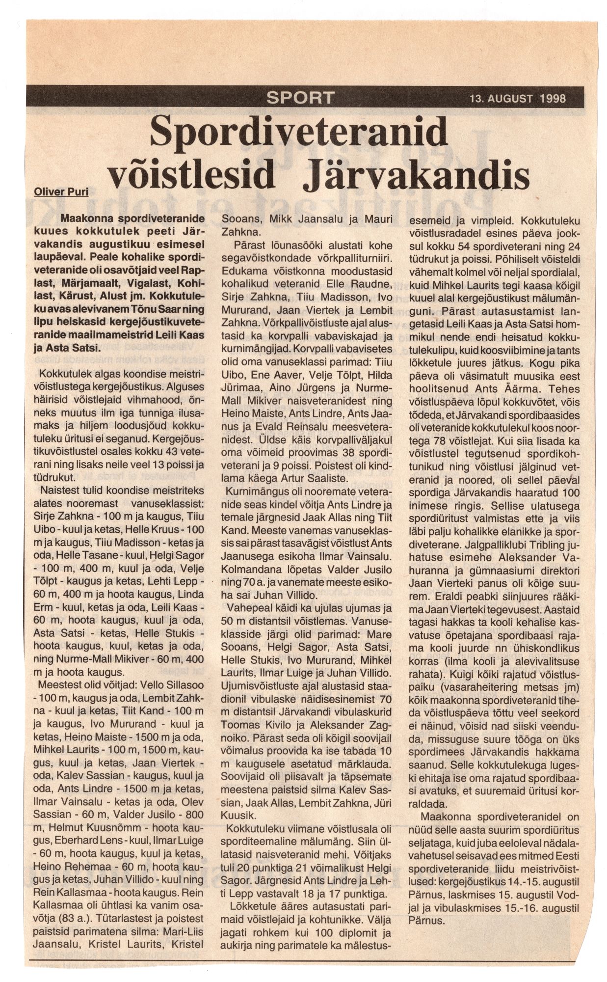 Artikkel Nädalises Raplamaa spordiveteranide VI kokkutulekust Järvakandis augustis 1998. Maakondlikud mängud.