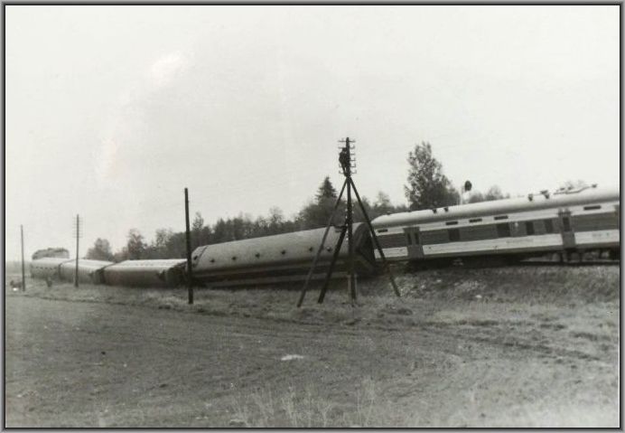 Pärnu-Tallinn rong pärast kokkupõrget veoautoga Lelle-Türi mnt ülesõidul 1974.