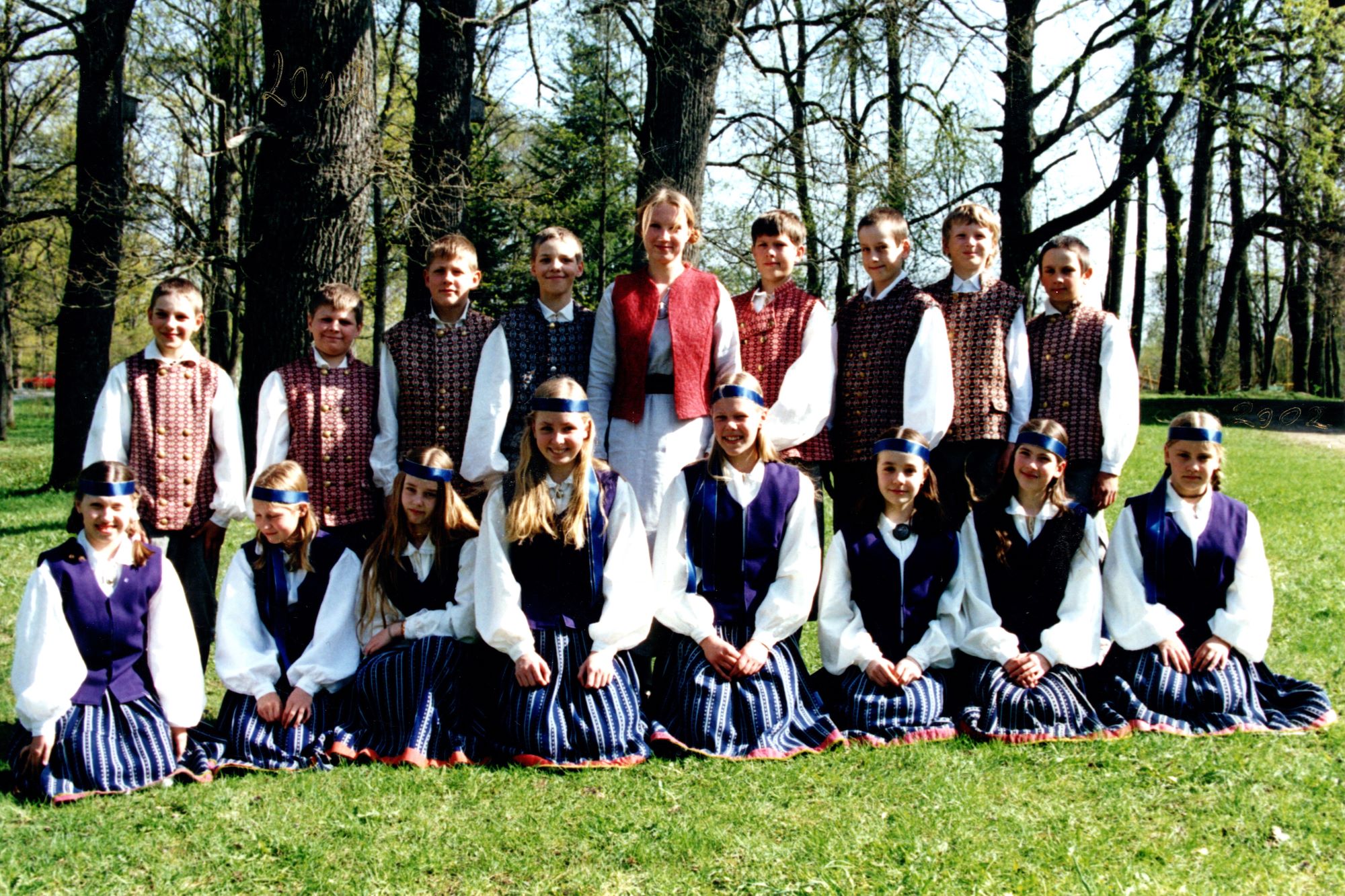 Kodila kooli õpilaste rahvatantsurühm Kodila kooli õuel 2002. Juhendaja Kärt Tilga.