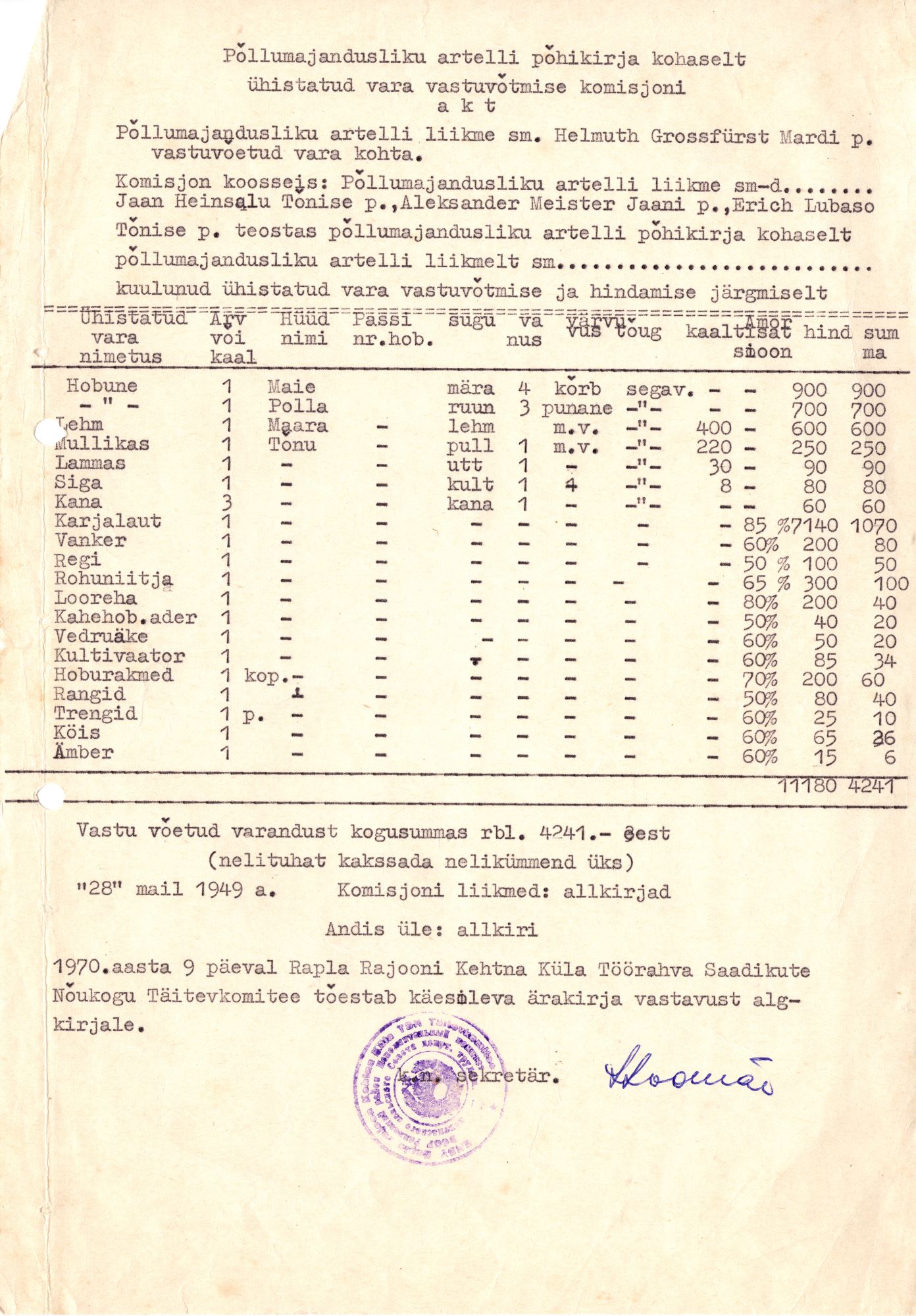 1949. aastal artelli astuja ühistatud vara vastuvõtmise akti ärakiri, mis on kinnitatud 1970. aastal Rapla Rajooni Kehtna küla Töörahva Saadikute Nõukogu Täitevkomitee poolt.