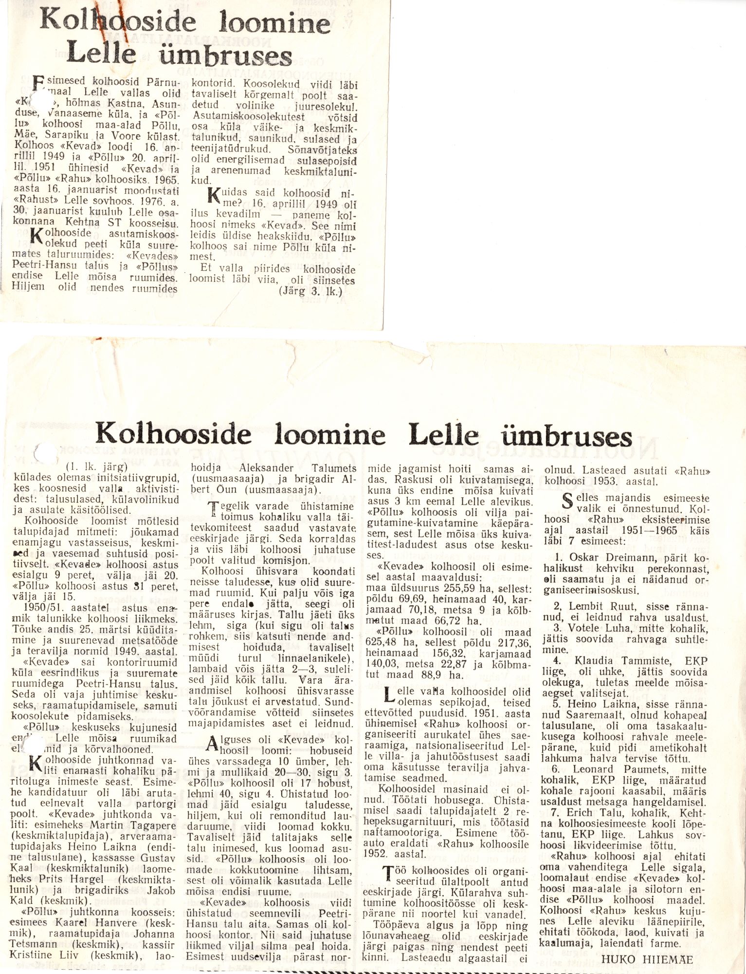 Huko Hiiemäe artikkel kolhooside loomisest Lelle ümbruses.