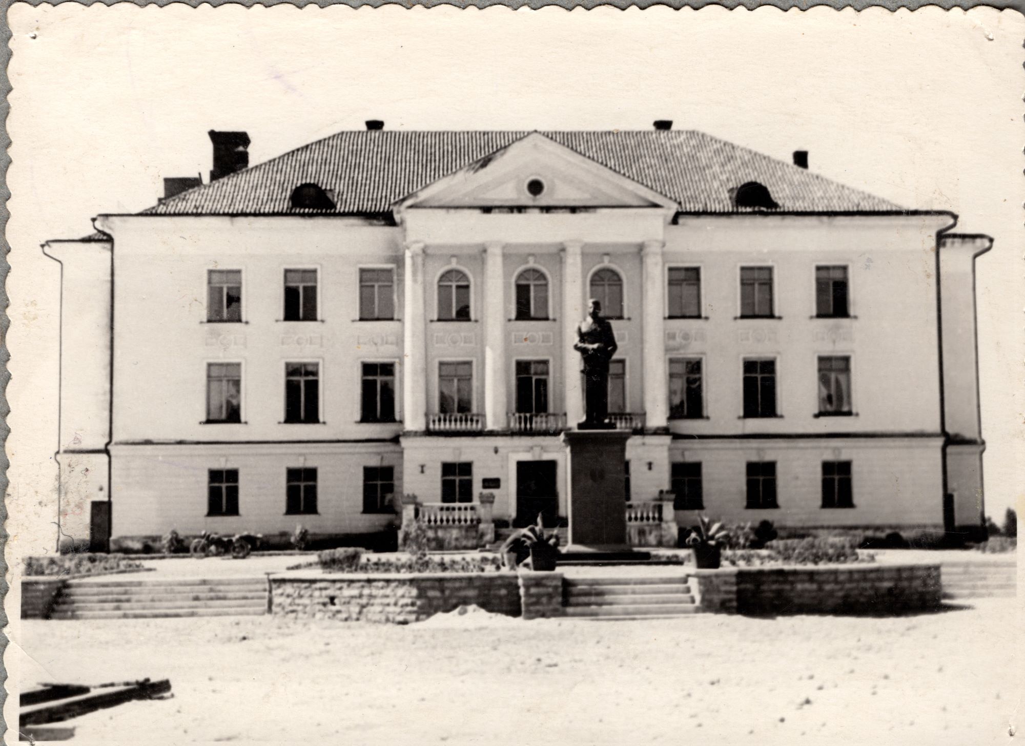 Kolhooside Juhtiva Kaadri Ettevalmistamise Riiklik Kool või 1951–58 Kolhooside Esimeeste Ettevalmistamise Põllumajanduskeskkool - hoone ees Stalini kuju.