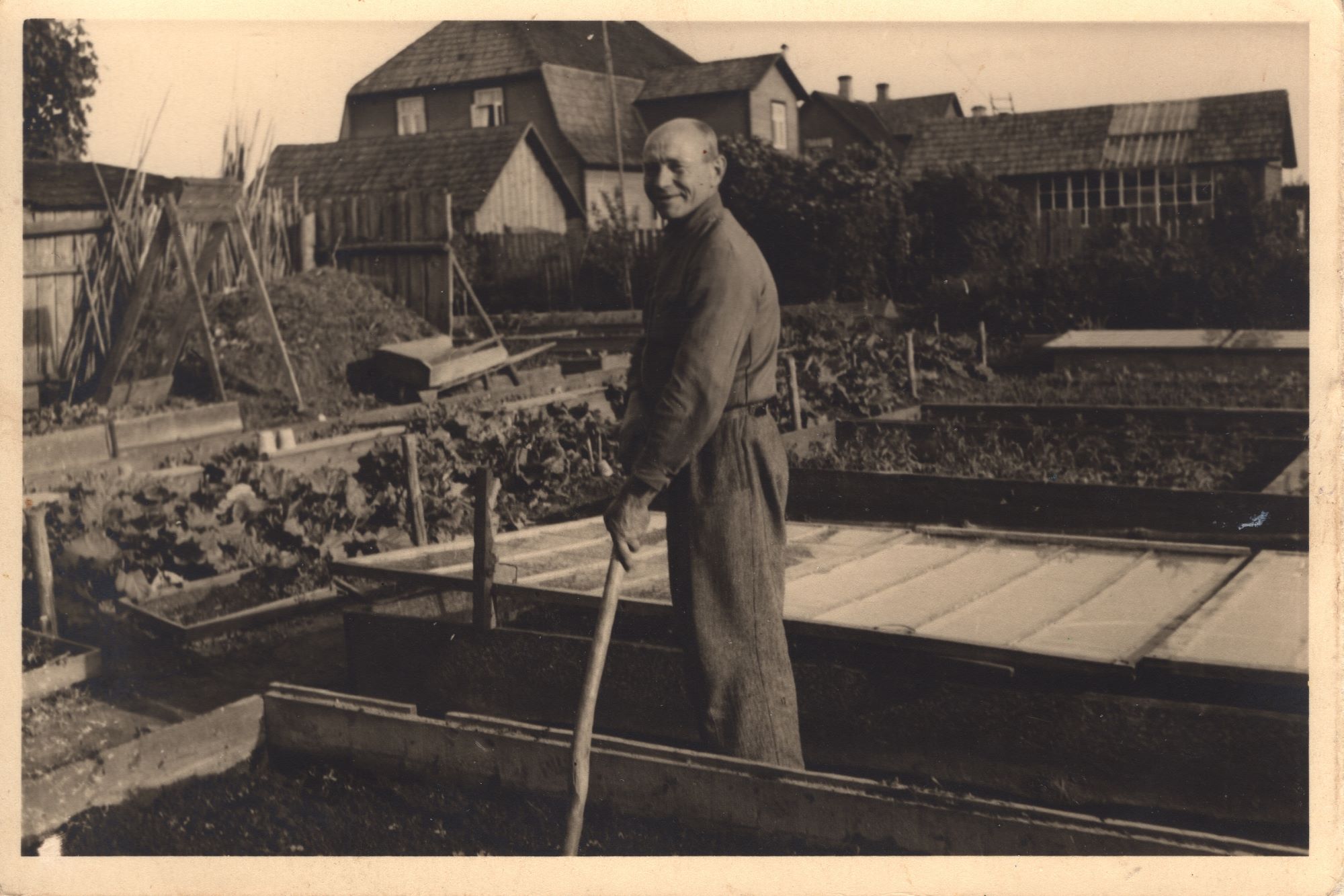 Riiv (end. Reismann) Jüri oma aias kevadel lavasid tegemas. Raplas Tallinna mnt. 34 aastal 1946. Täpsustatud info.