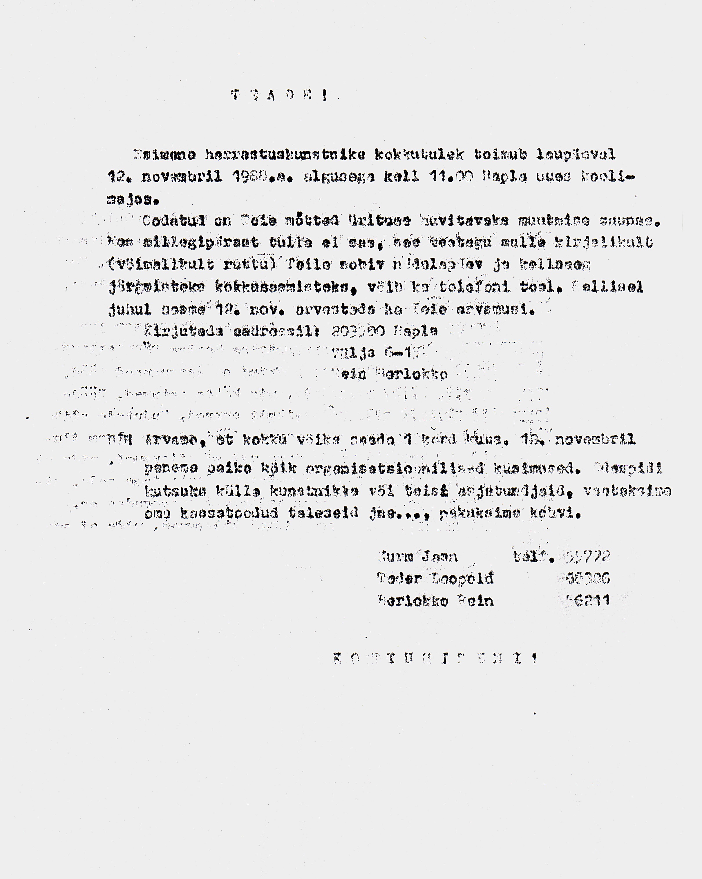 Kutse Rapla rajooni kunstnikele kokkusaamiseks Rapla II Keskkoolis 12. nov 1988. Sellest sai alguse kunstiklubi.