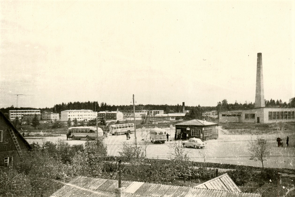 Bussijaam Mahlamäel, paremal Mahlamäe kõrge korstnaga katlamaja, tänapäeval samal kohal korterelamu Mahlamäe tn 7.
