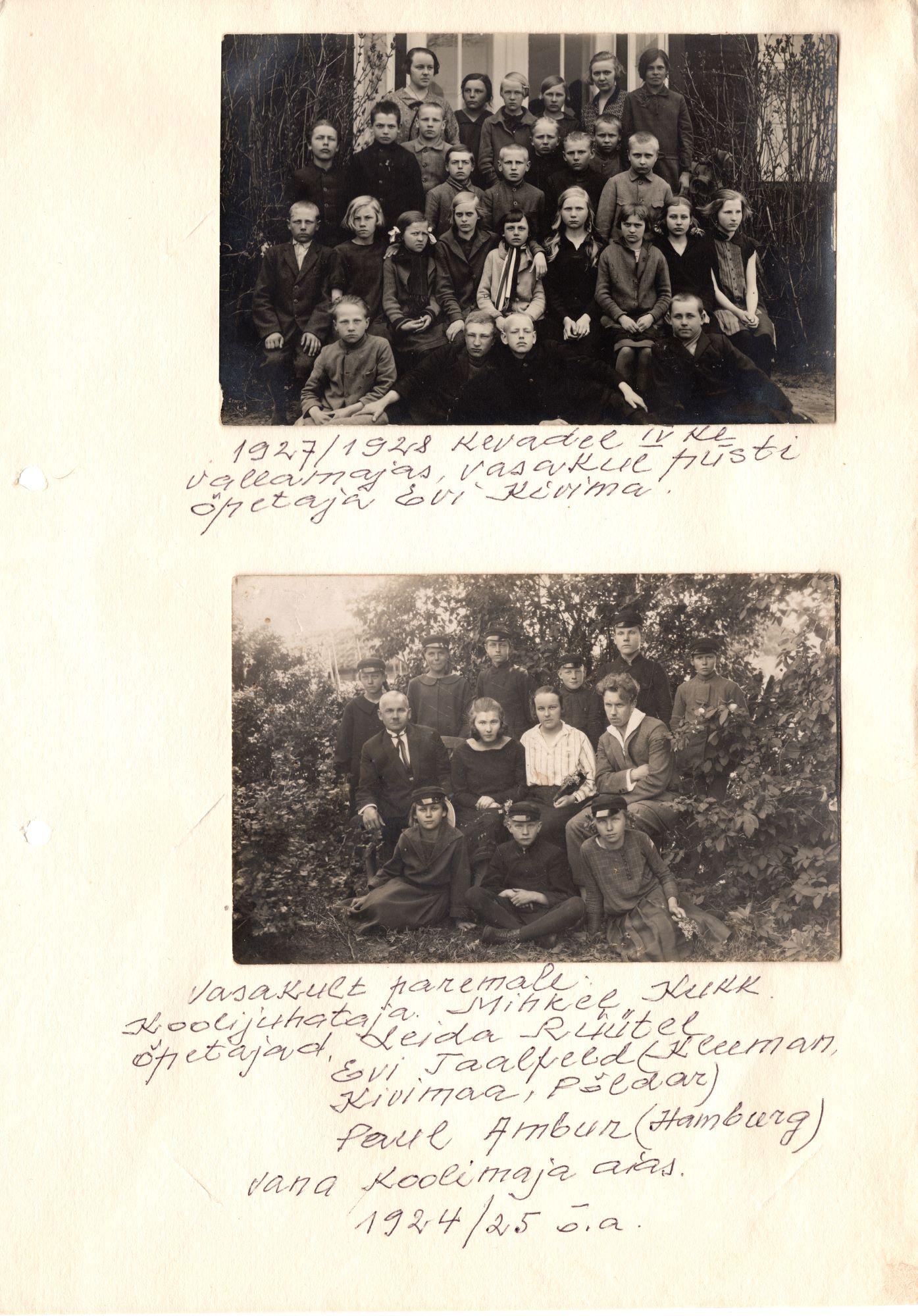Ülemisel pildil Kehtna algkooli IV klass vallamaja ees 1928 aasta kevadel. Õpetaja Evi Kivimaa. Alumisel pildil vana koolimaja aias 1925. aastal - koolijuhataja Mihkel Kukk, õpetajad Leida Rüütel, Evi Taalfeld (Kleeman, Kivimaa, Põldar) ja Paul Ambur (Hamburg).