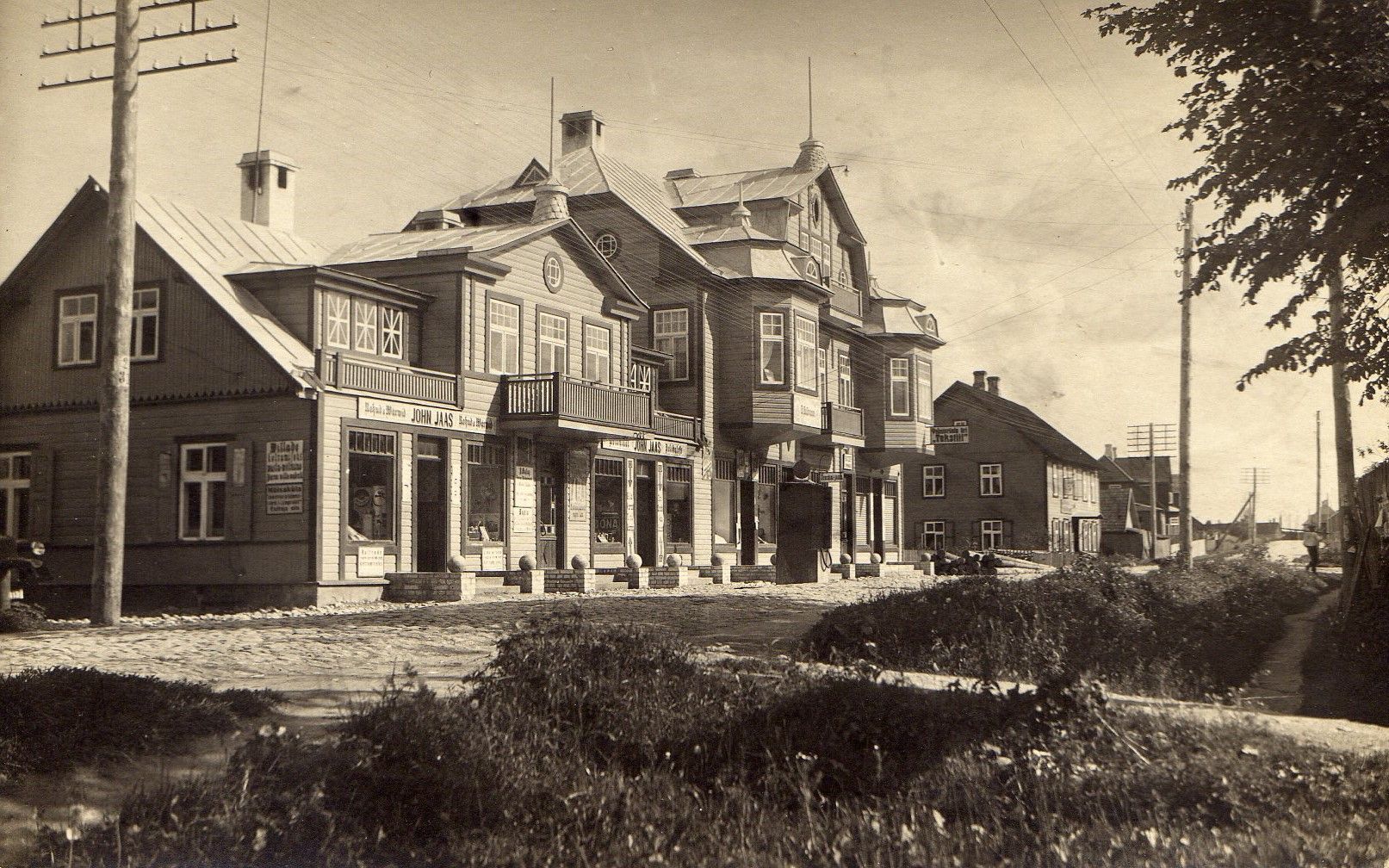 Foto Johannes Jaasile kuulunud majast Raplas, praegune aadress Tallinna mnt 23. Majas olid nii elu- kui äriruumid: Jaasi äri Rohud ja Värvid, valmisriiete kauplus Tekstiil (neis ruumides 1970.-1980ndatel ETKVL-i galanteriikauplus) jt. Valmis lõplikult 1933, kuid oli selleks ajaks müüdud uuele omanikule. Foto tehtud kas 1930ndate algul või 1920nd lõpus