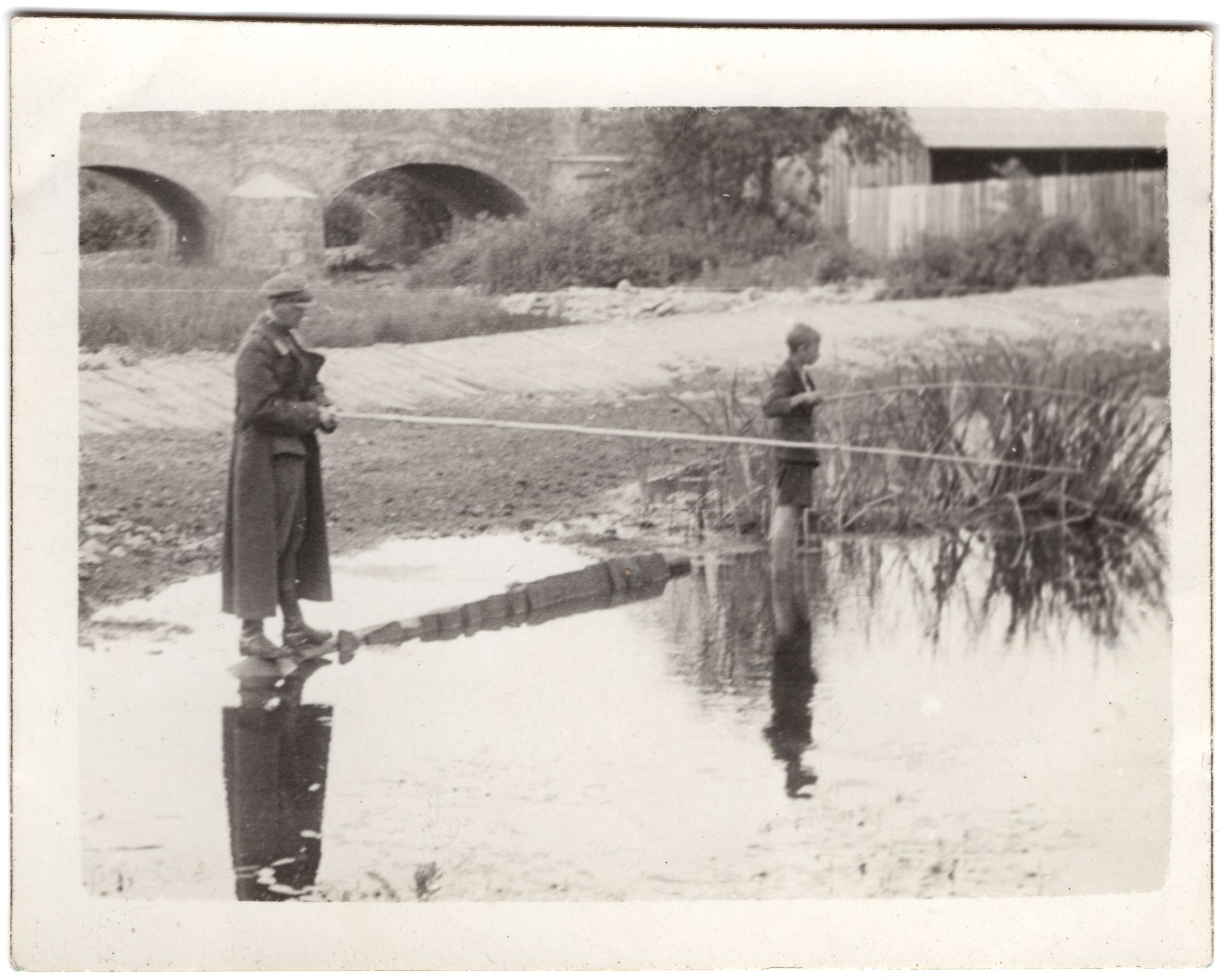 Fotol on kujutatud meesterahvast ja poissi Kohila jõe ääres kala püüdmas.