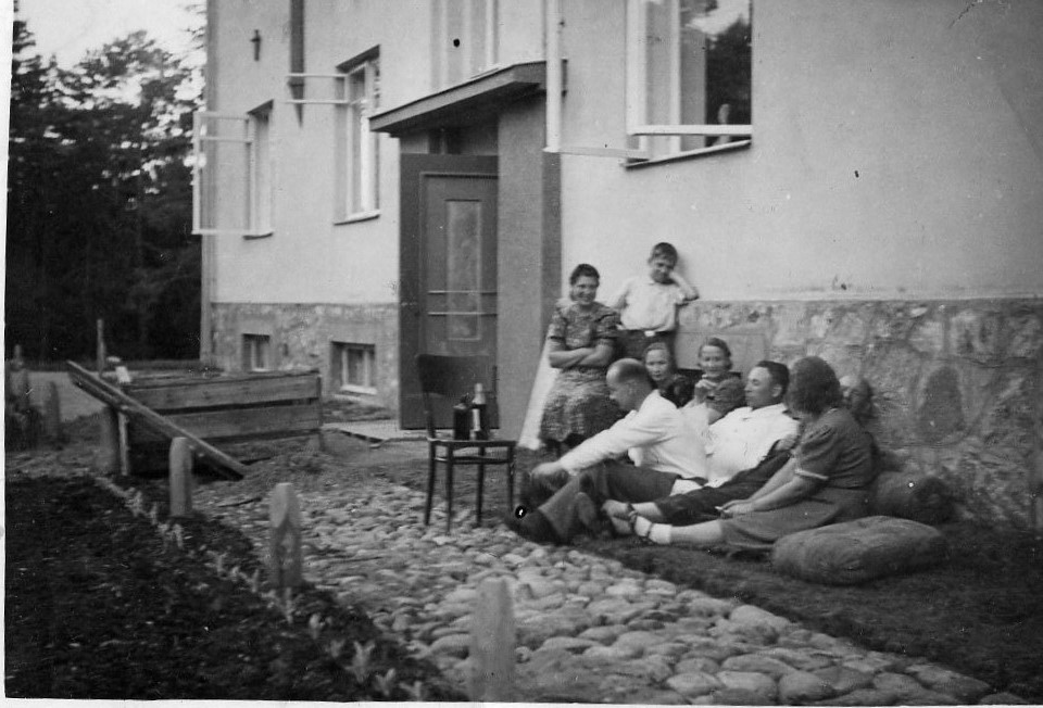 Viljandi mnt 9 maja ees. Algselt oli selles Rumbergi pood, elumaja üürikorteritega. Foto tehtud 1930. aastate teisel poolel. Vasakult: toolil perenaine Rumberg, maas istuvad Hella Loo, Marta Haasma, tundmatu, Hans Haasma, kaks tundmatut, Valdur Loo (Eesti ohvitser; 1901, Tallinn - 1942, Norilsk). Nõukogude perioodil olid hoones Rapla partei- ja komsomolikomitee, alates 1974-1996 Rapla keskraamatukogu.