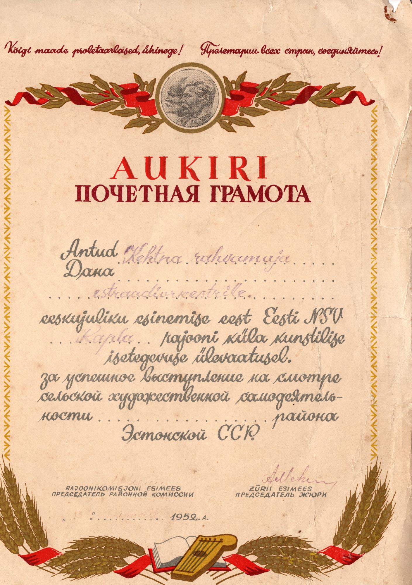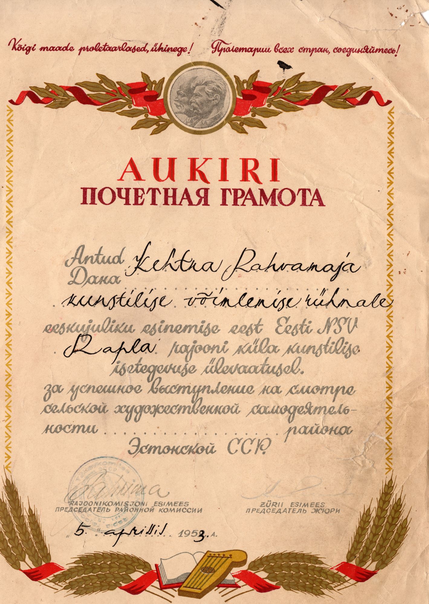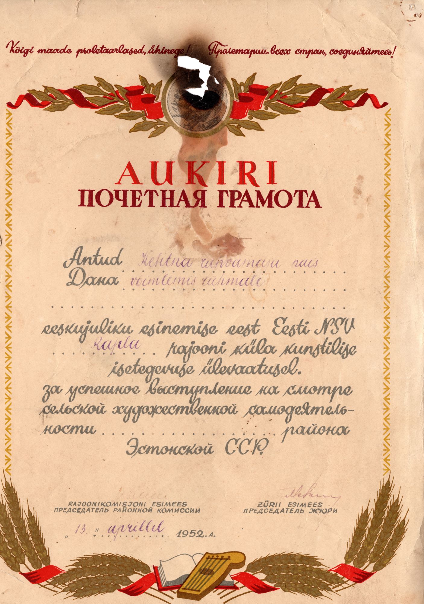 Diplomid, mis on antud Kehtna rahvamajas tegutsenud kollektiividele aastatest 1952 kuni 1958. Peale Stalini isikukultuse lõppu on püütud tema pilti diplomitelt eemaldada.