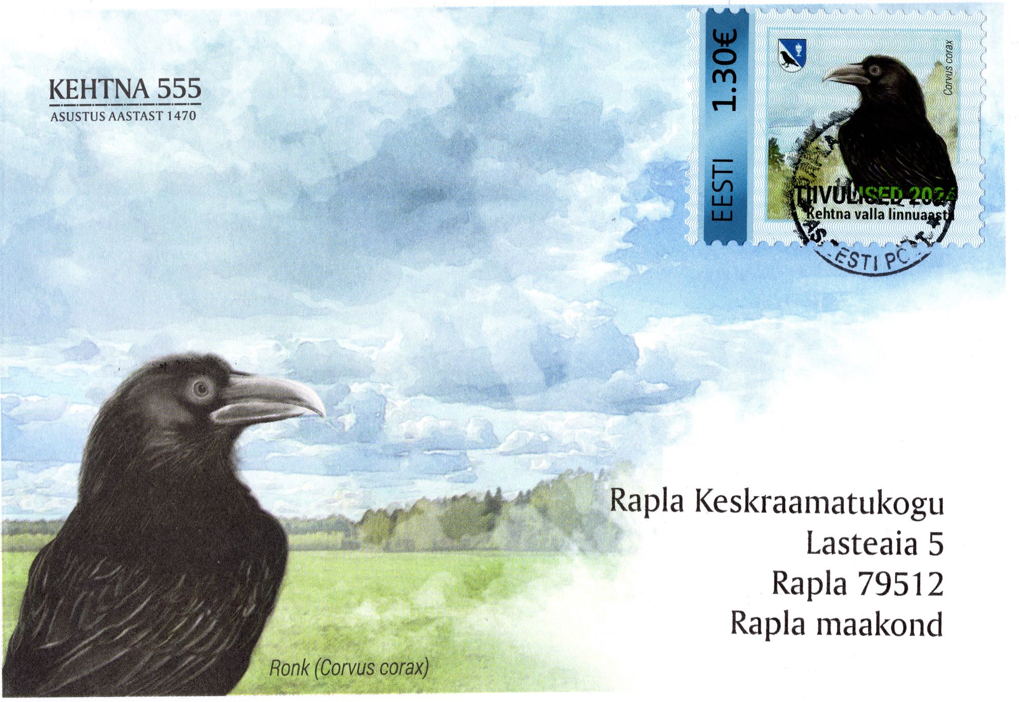 Ronk (Corvus corax) Kehtna valla sümbol. Ümbrik antud välja tähistamaks Kehtna asustust aastast 1470. Ümbrik saadetud Kehtna vallavalitsusest Rapla Keskraamatukokku 2024. a.
