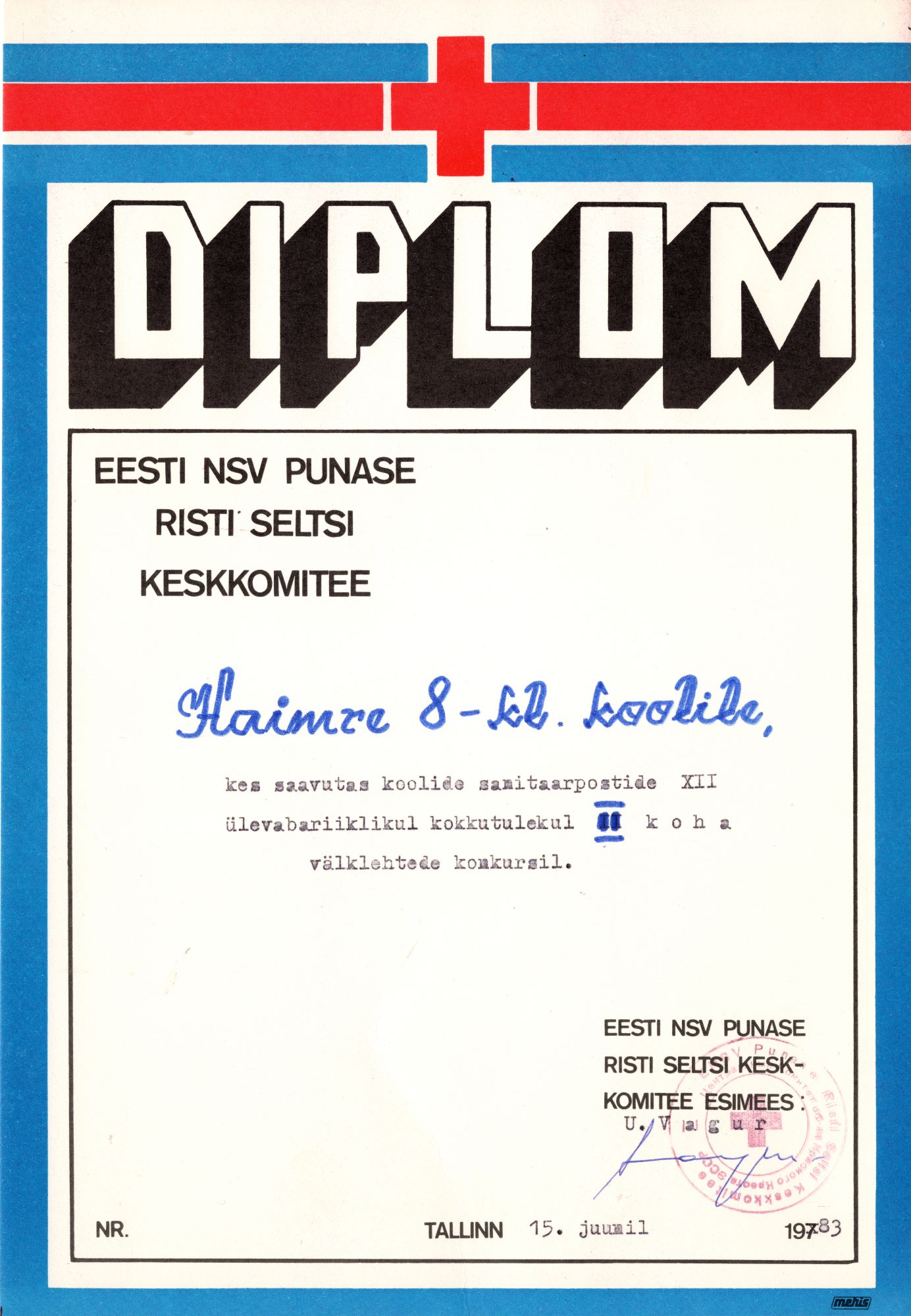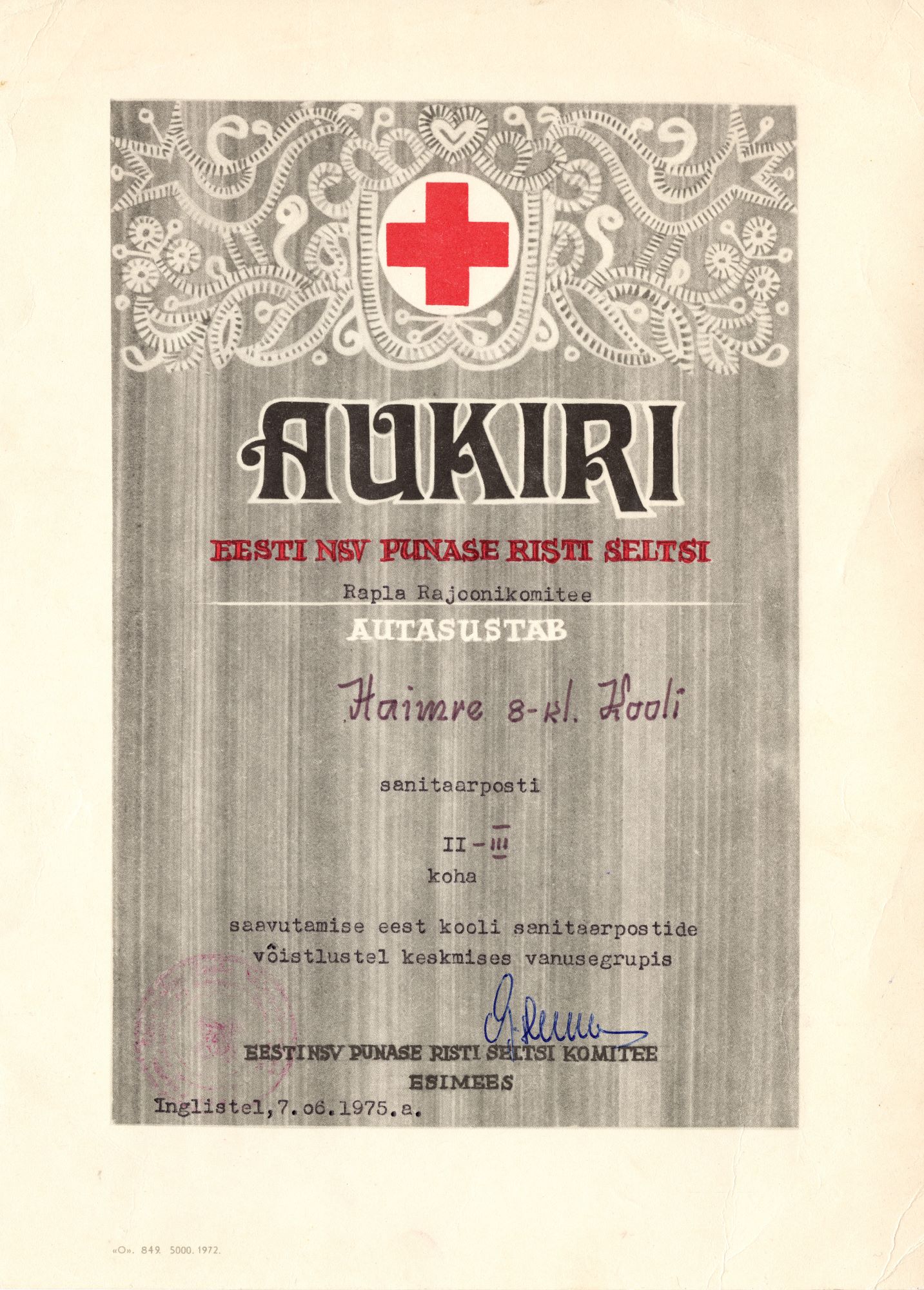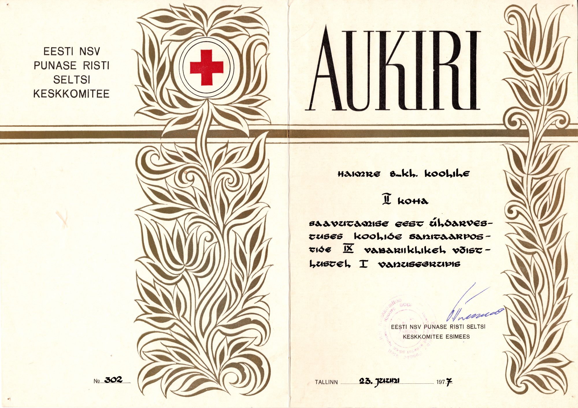 Haimre kooliis tegutsenud Punase risti allorganisatsioonile omistatud aukirjad ja tänukirjad. Aastast 1973-1983.