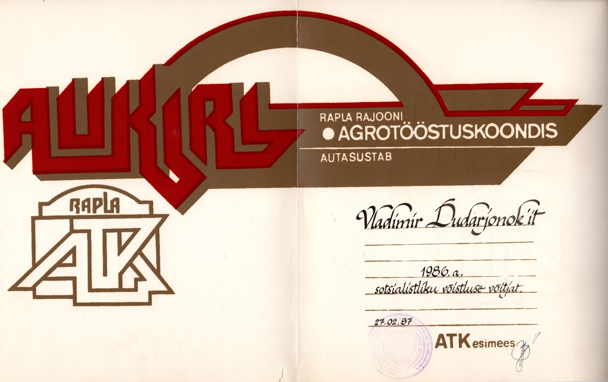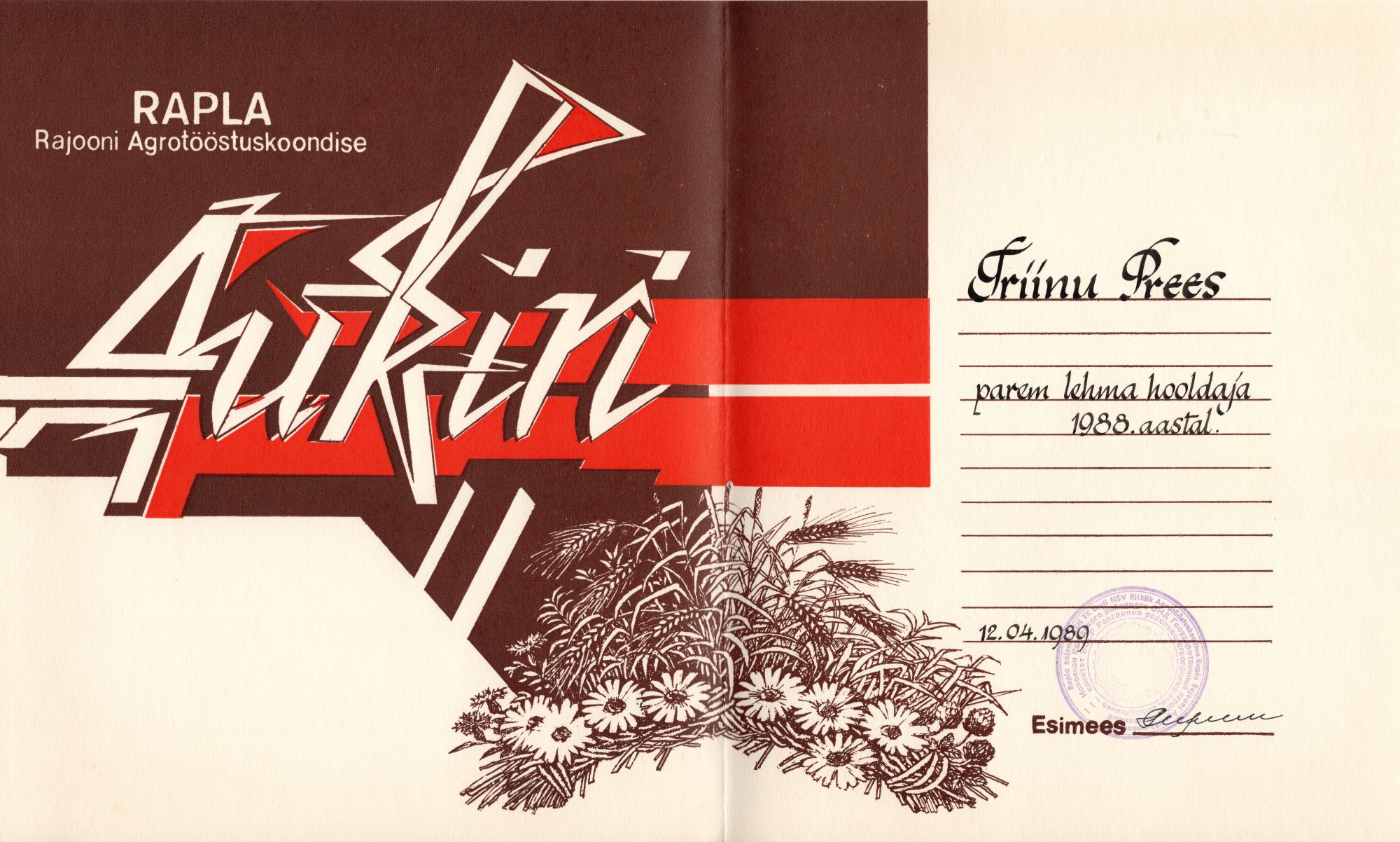 Aukirjad antud Rapla rajooni agrotööstuskoondise poolt 1980ndate lõpus.