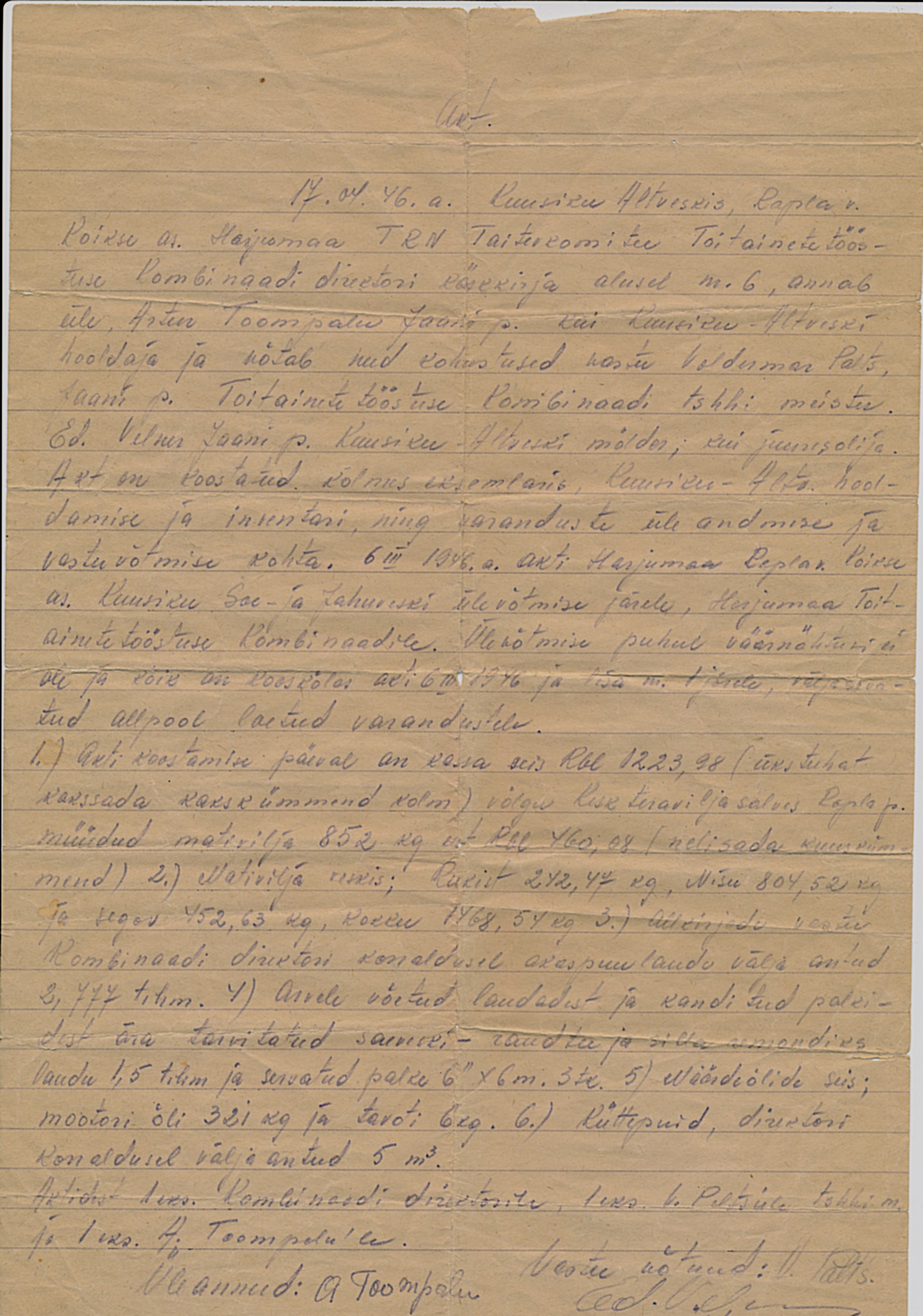 Kuusiku Altveski sae- ja jahuveski üleandmise akt: Artur Toompalu annab veski üle Harjumaa Toiduainetetööstuse Kombinaadile 17.04.1946.