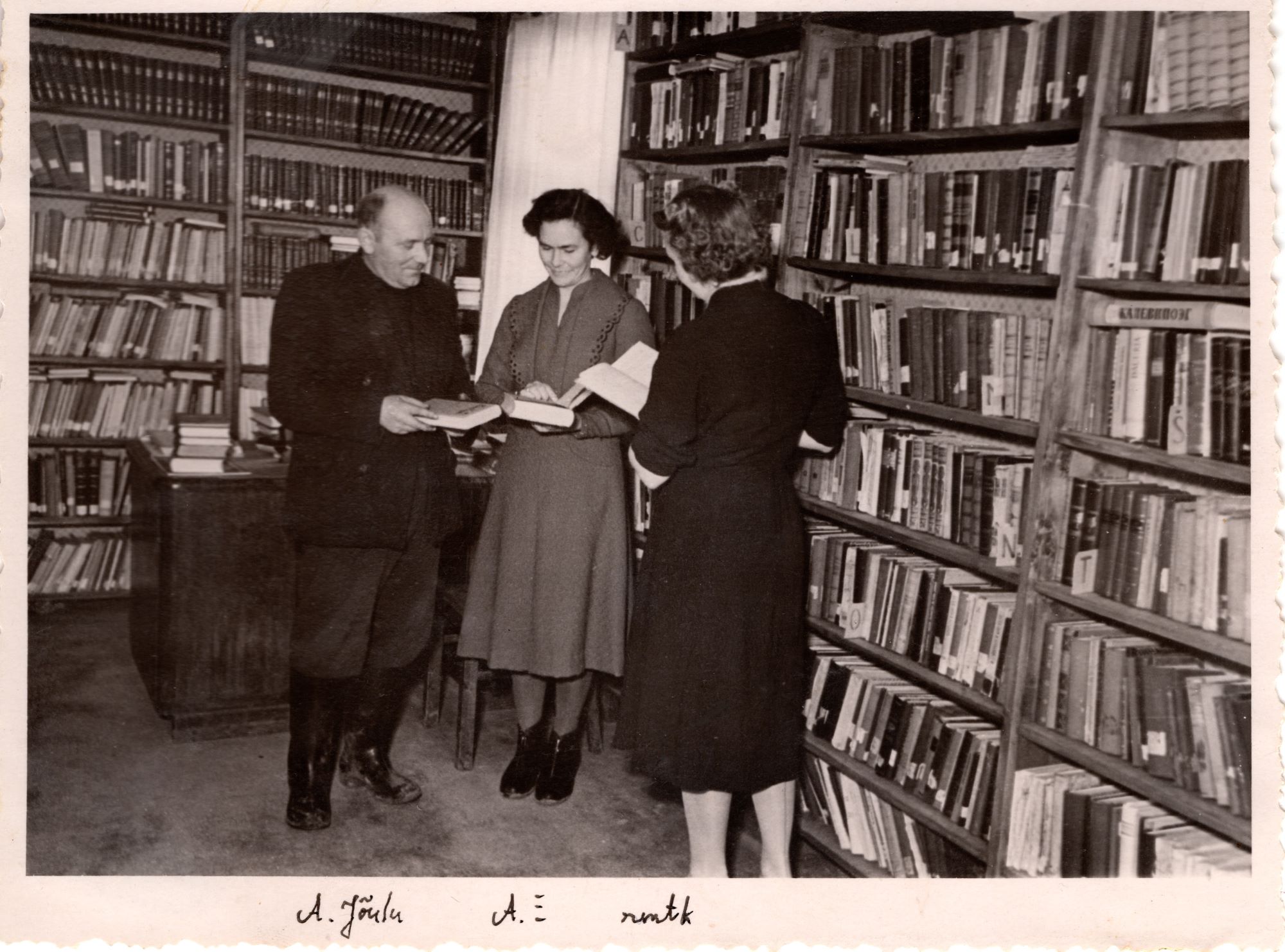 Valtu raamatukogus tehtud foto ilmselt 1950ndate lõpupoole. Fotol tollane raamatukogu juhataja Aino Ellermaa (kes oli juhataja 1955-1958) ja Arnold Jõulu. Kolmas osaline tundmatu.
