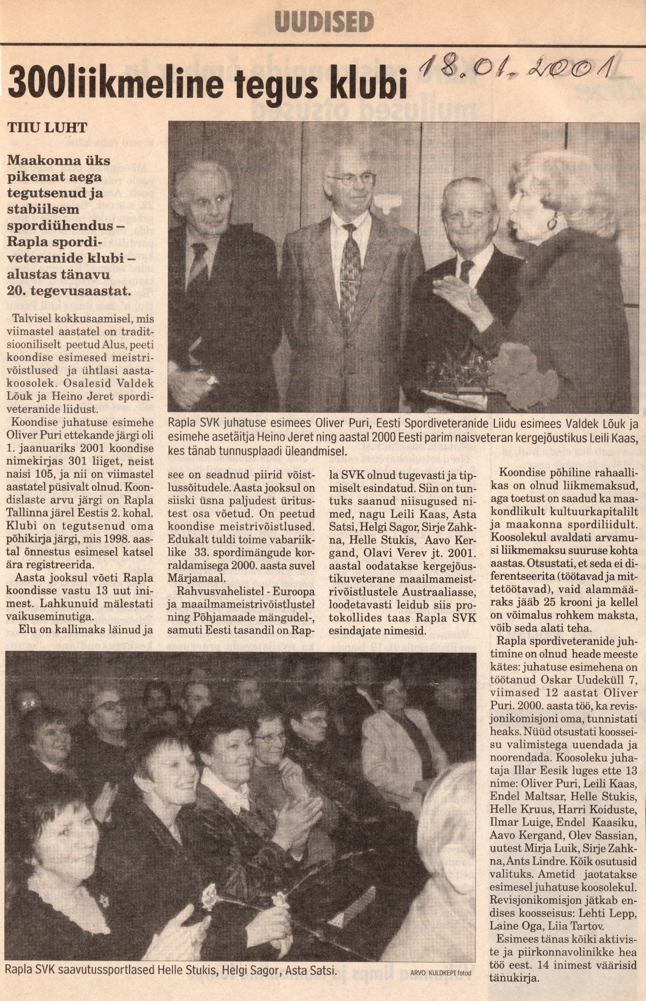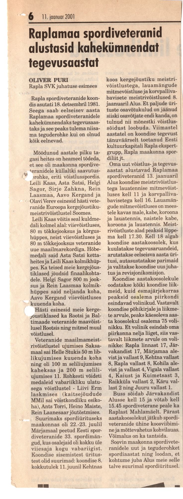 Rapla Spordiveteranide Koondise kahekümnes tegevusaasta. Artikkel Oliver Puri sulest 2001 aasta Nädalisest. Teine artikkel samal teemal Tiiu Luhtilt.