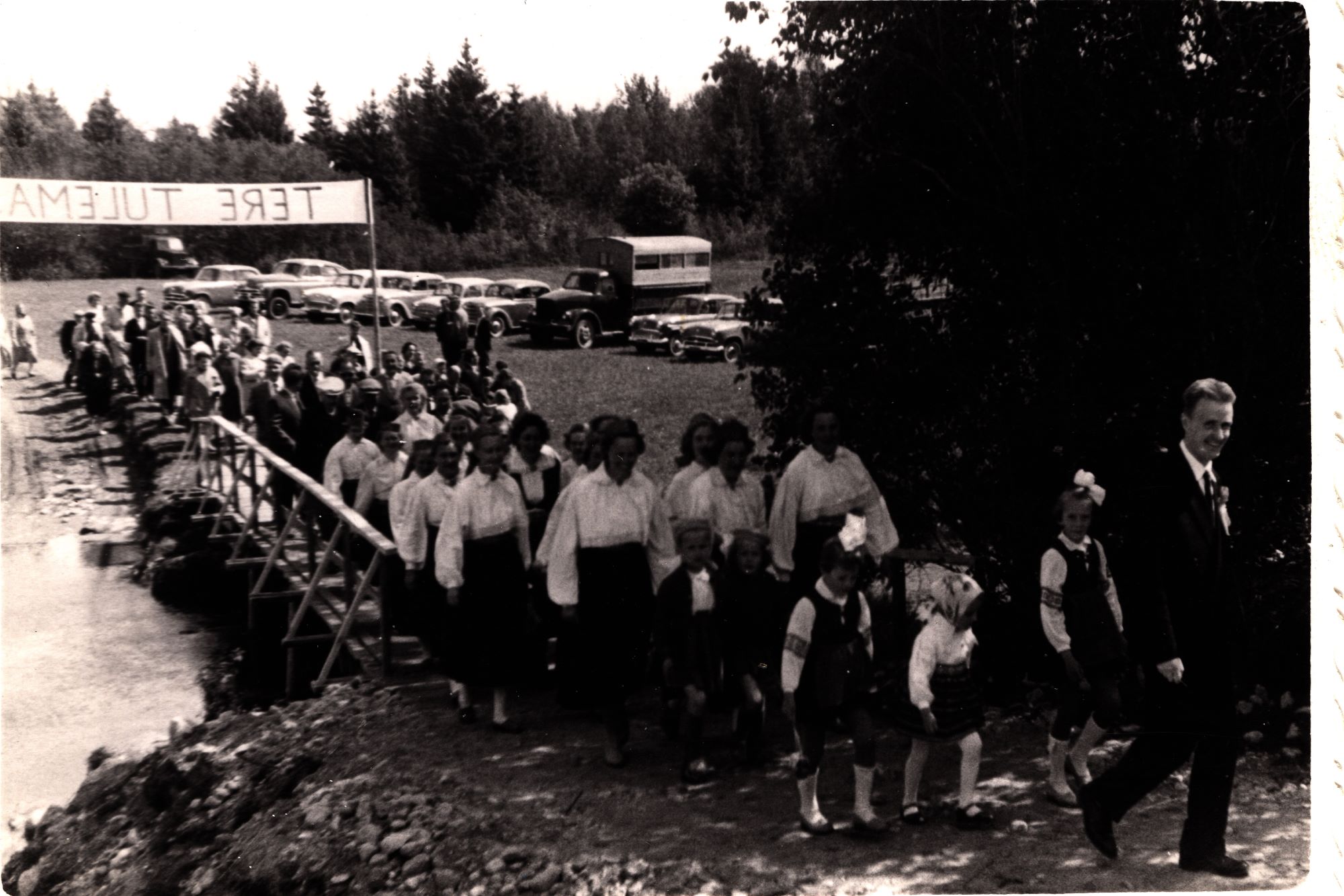 Rapla laulupeo rongkäik 1950-ndatel Sulupere metsas.Kõige ees Ülo Väling.