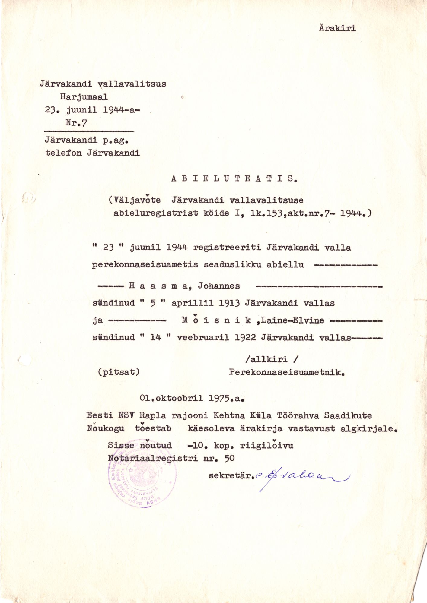 Ärakiri 1944. a. abieluteatisest, välja antud Järvakandi vallavalitsuse abieluregistrist aastal 1975.