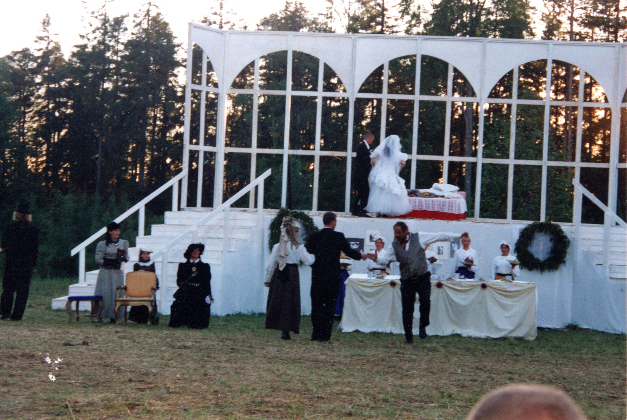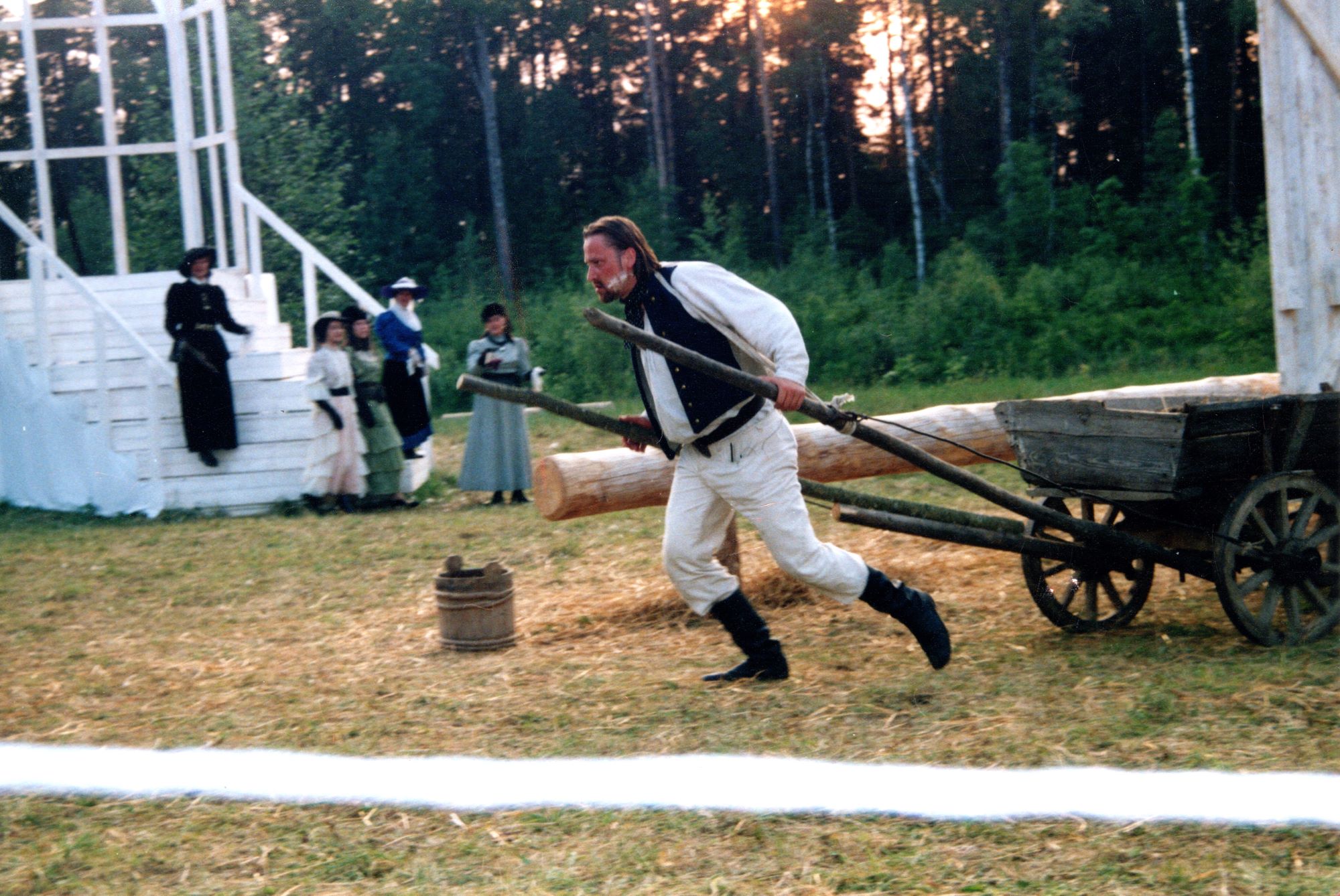 Maakonna vabaõhu-etendus "Tagaaetav, ehk, Rummu Jüri" Lelle mõisa juures juunis 2000. Osades nii taidlejad kui kutselised näitlejad. Rummu Jüri osatäitja Üllar Saaremäe.