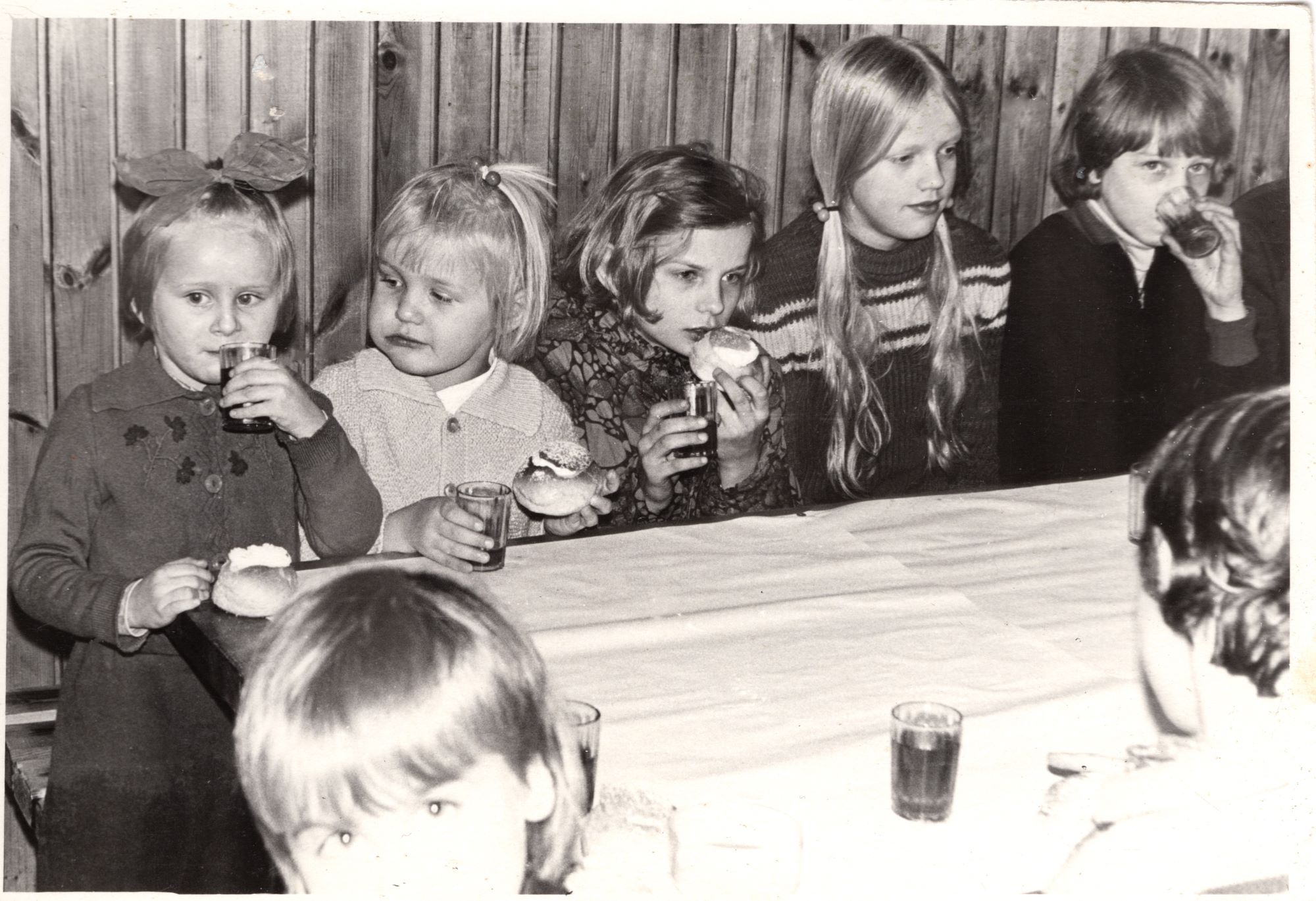 2. Fotol Rapla KEK-i töötajate lapsed vastlapäeva tähistamas 1974. a. KEK-i sööklas.