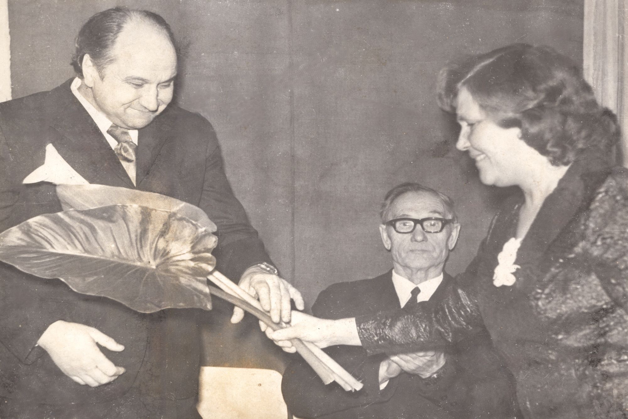 Esimesel fotol õnnitletakse Raikküla kolhoosi esimeest Harri Kuusemetsa. Istub Johannes Saia.