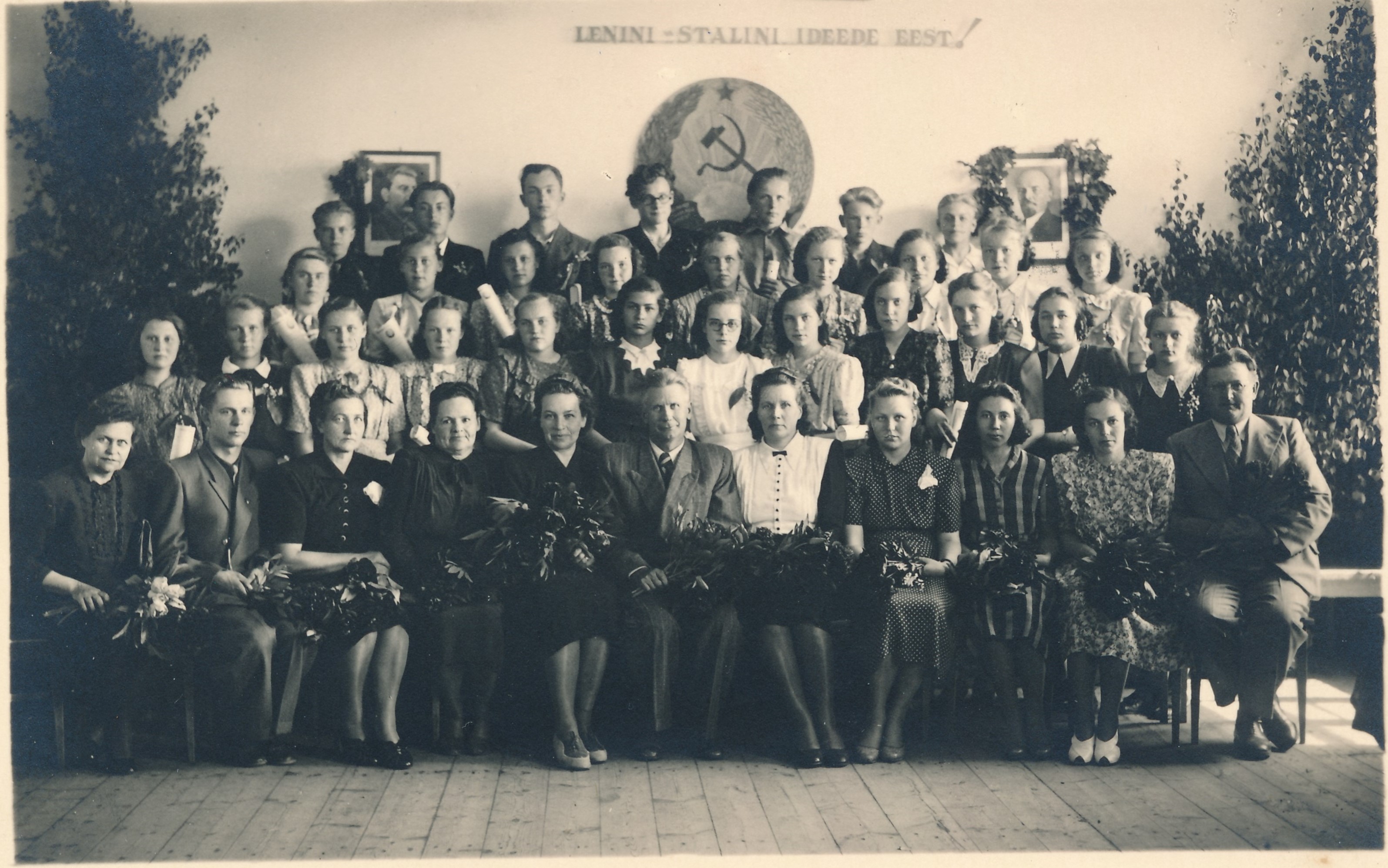 Esireas õpetajad vasakult: Sinaida Talving, Hans Makus, Liisa Tiitso, Marie Tuulmets, Elvine Nuga (klassijuhataja), August Uuepõllu (direktor), Frieda Oskar, Ilse Klauman, Evi Kuusmaa, Hermilde Lokk, Martin Laurimaa.