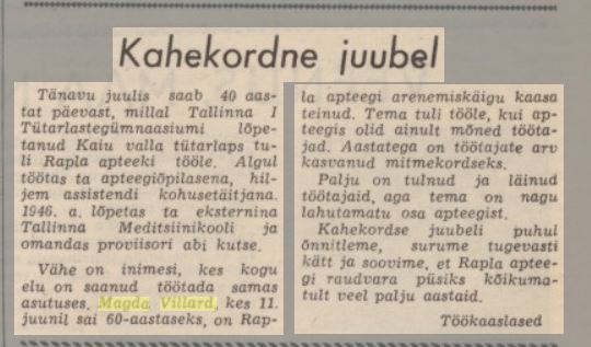Rapla apteegi kauaaegne töötaja Magda Villard (11.06.1909-17.03.1981). Artikkel M. Villardi kohta Rapla rajooni ajalehest Ühistöö 12. juuni 1969.