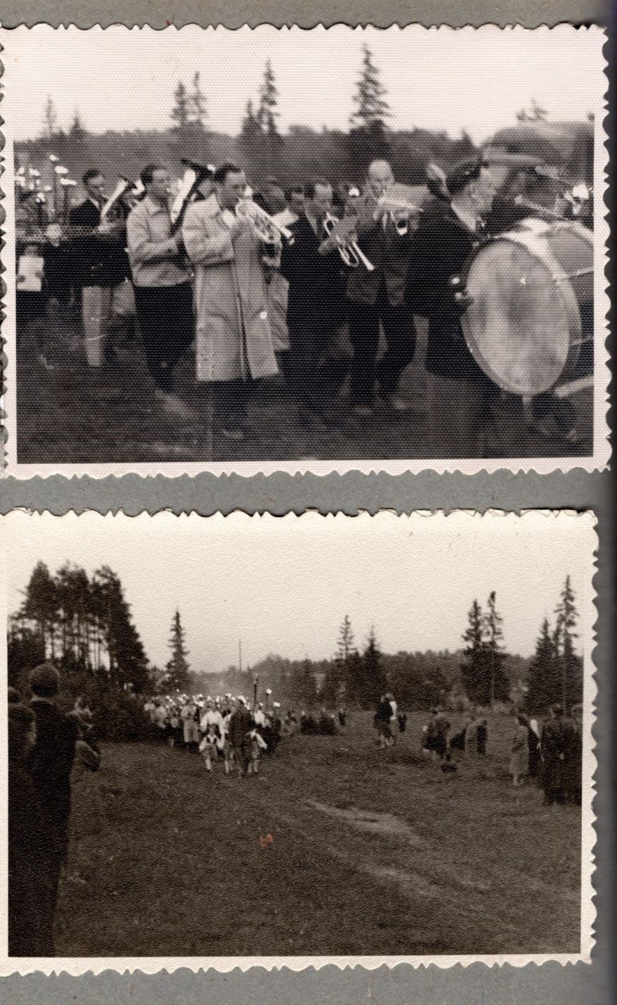 Jaanituli 1959. a. Kehtnas. Esimesel pildil orkester ja teisel rongkäik suundumas traditsioonilisse jaanitule paika Kehtna männitukas.