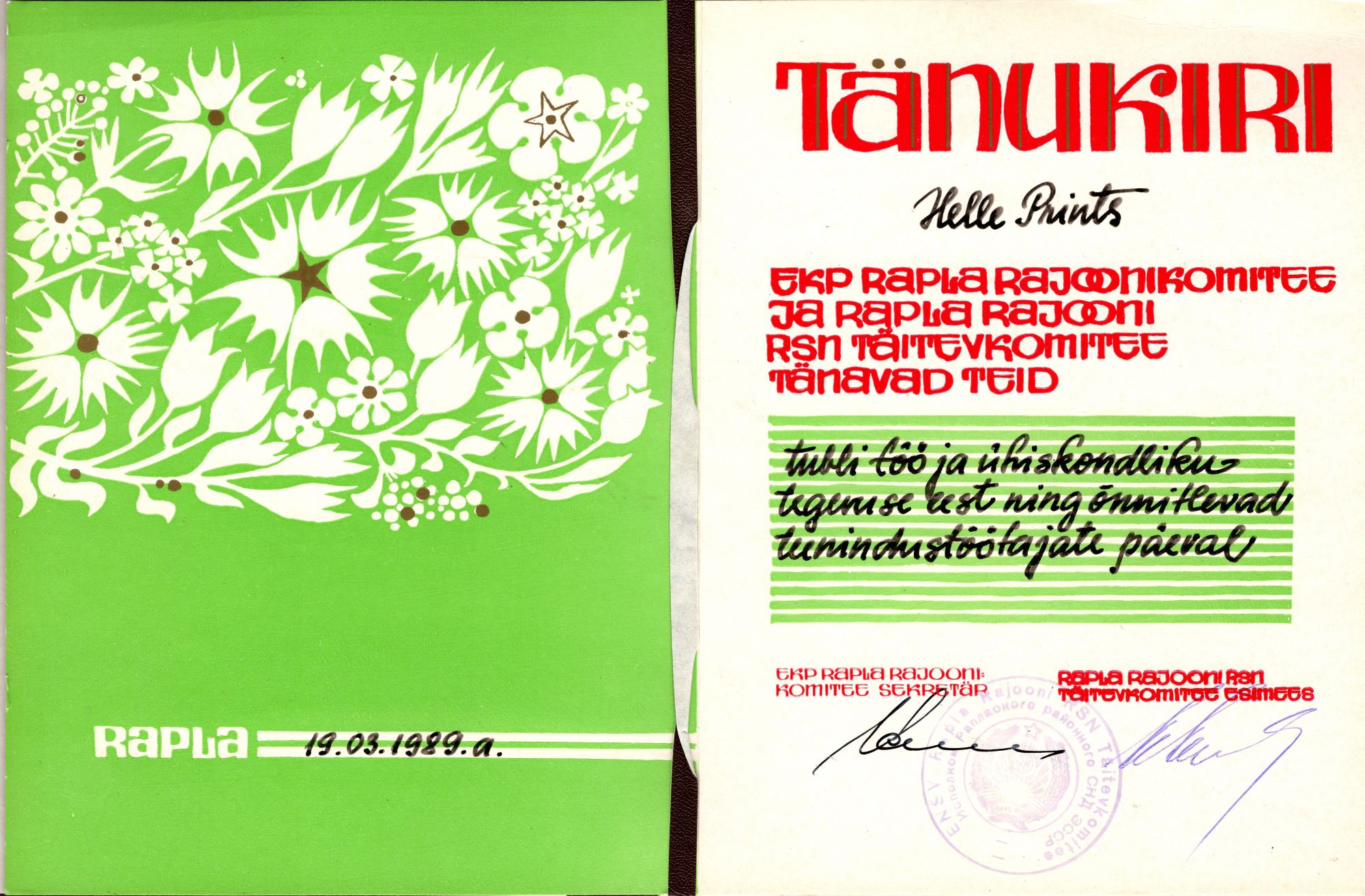Teenindustöötajate päeval Helle Printsule antud tänukiri tubli töö ja aktiivse ühiskondliku tegevuse eest. Aasta 1989.