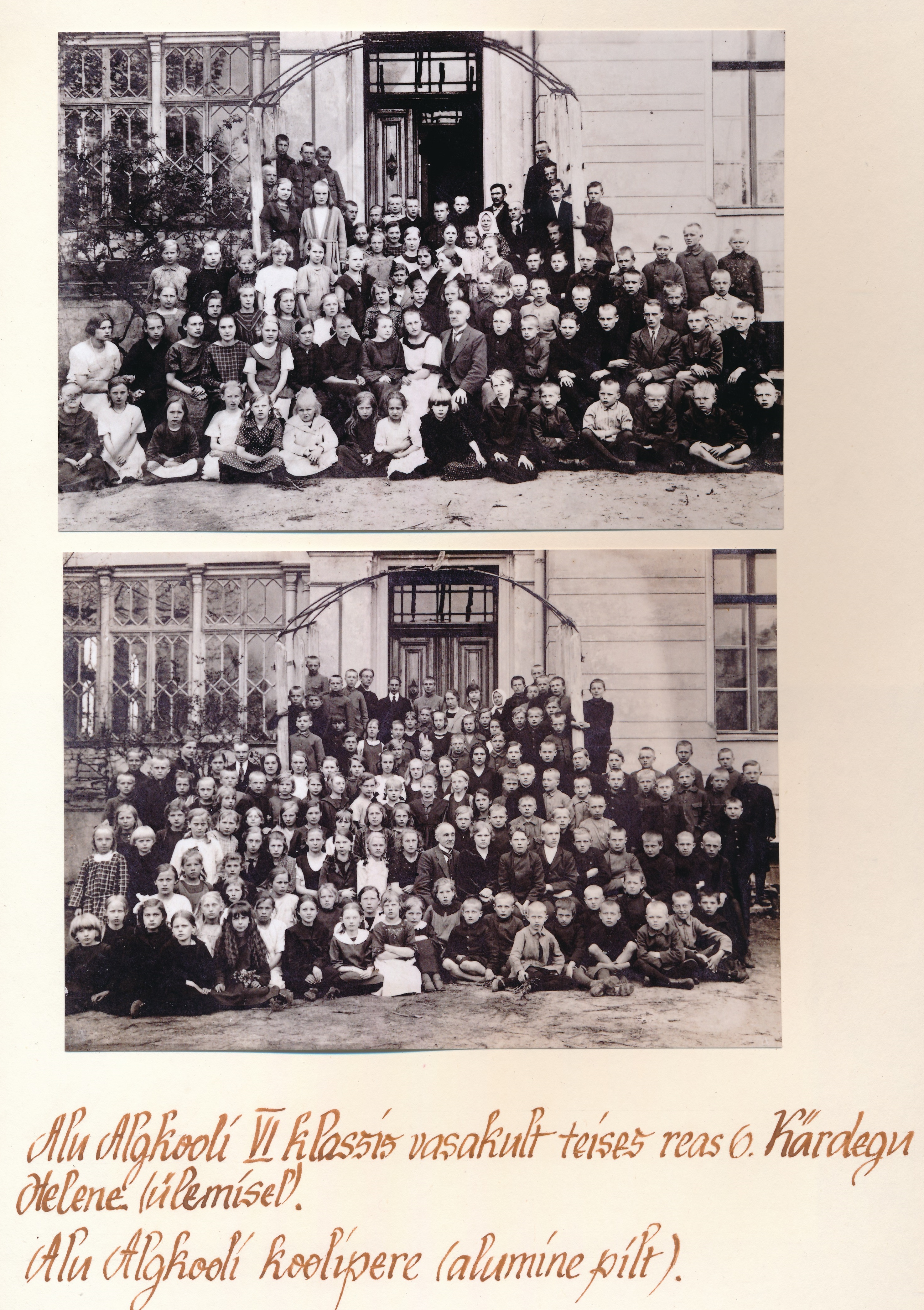 Albumifotodel Alu algkooli (paiknes mõisahoones) õpilased ja õpetajad. Ühel fotol dateering: proua Nõu sünnipäeval 1931. aastal.