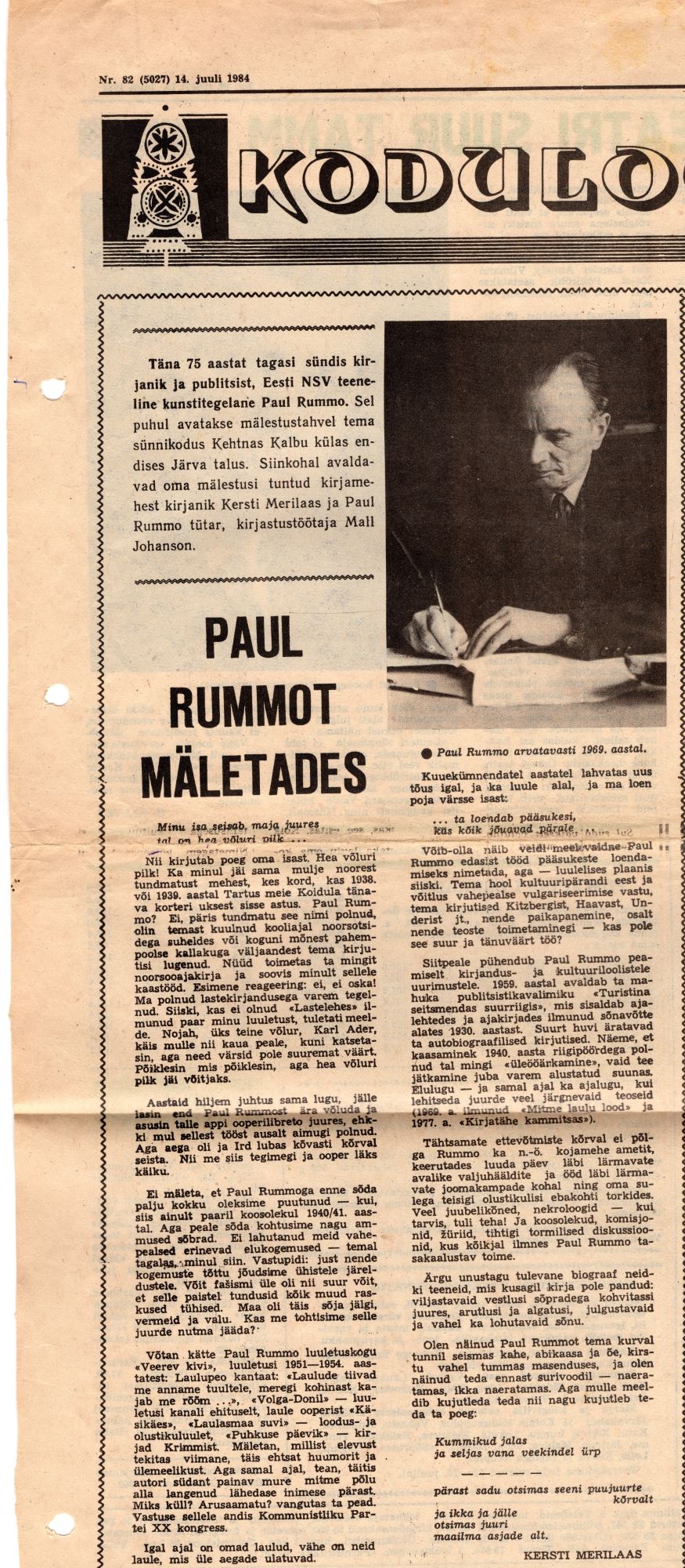 Artikkel Ühistöös rubriigis Koduloolane "Paul Rummot mäletades". Ilmus 14. juulil 1984.