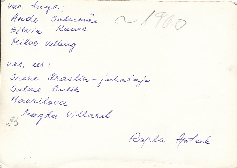 Rapla apteegi töötajad oma töövormis. Foto tagaküljel nimed: esireas vasakult: Irene Krastin (juhataja), Salme Aulik, ..Gavrilova, Magda Villard, tagareas: Ande Salumäe, Silvia Raave, Vilve Velberg.