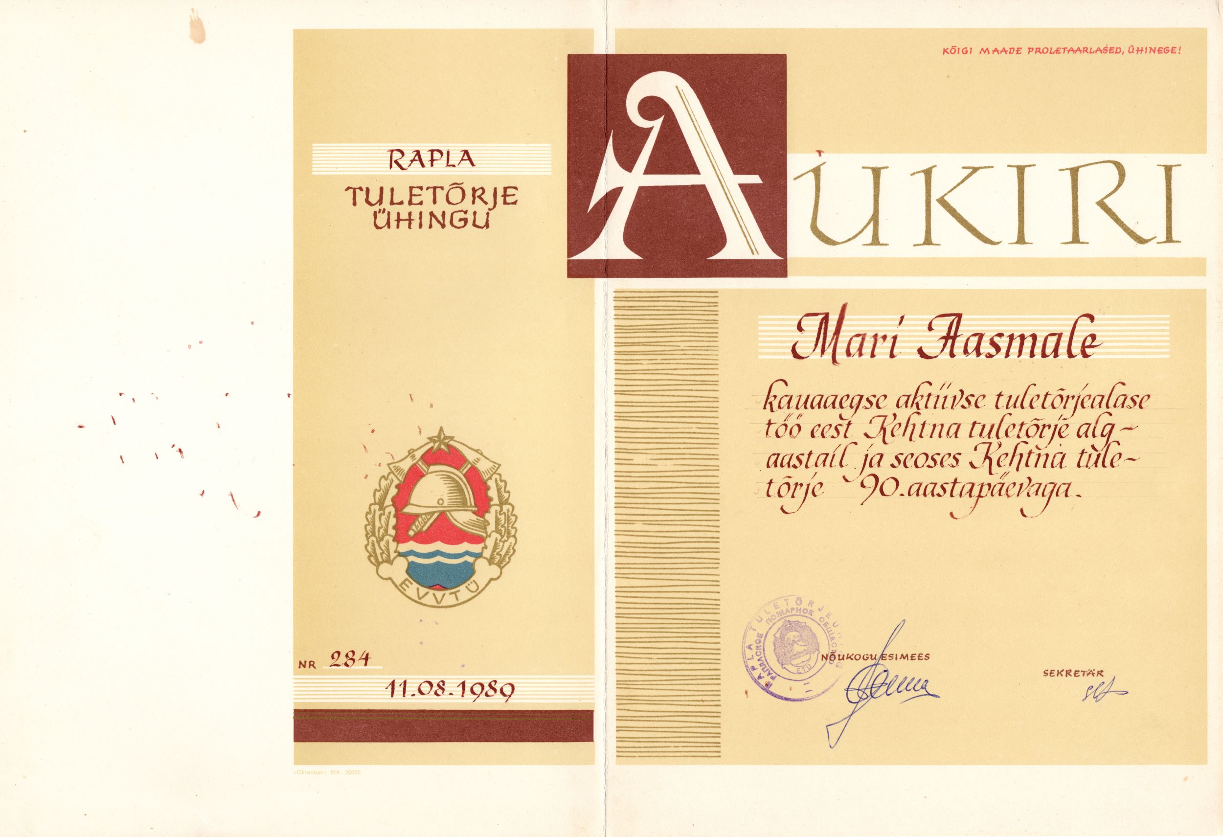 Rapla Tuletõrjeühingu poolt antud aukiri Mari Aasmale kauaaegse aktiivse tuletõrjealase töö eest Kehtna tuletõrjes.