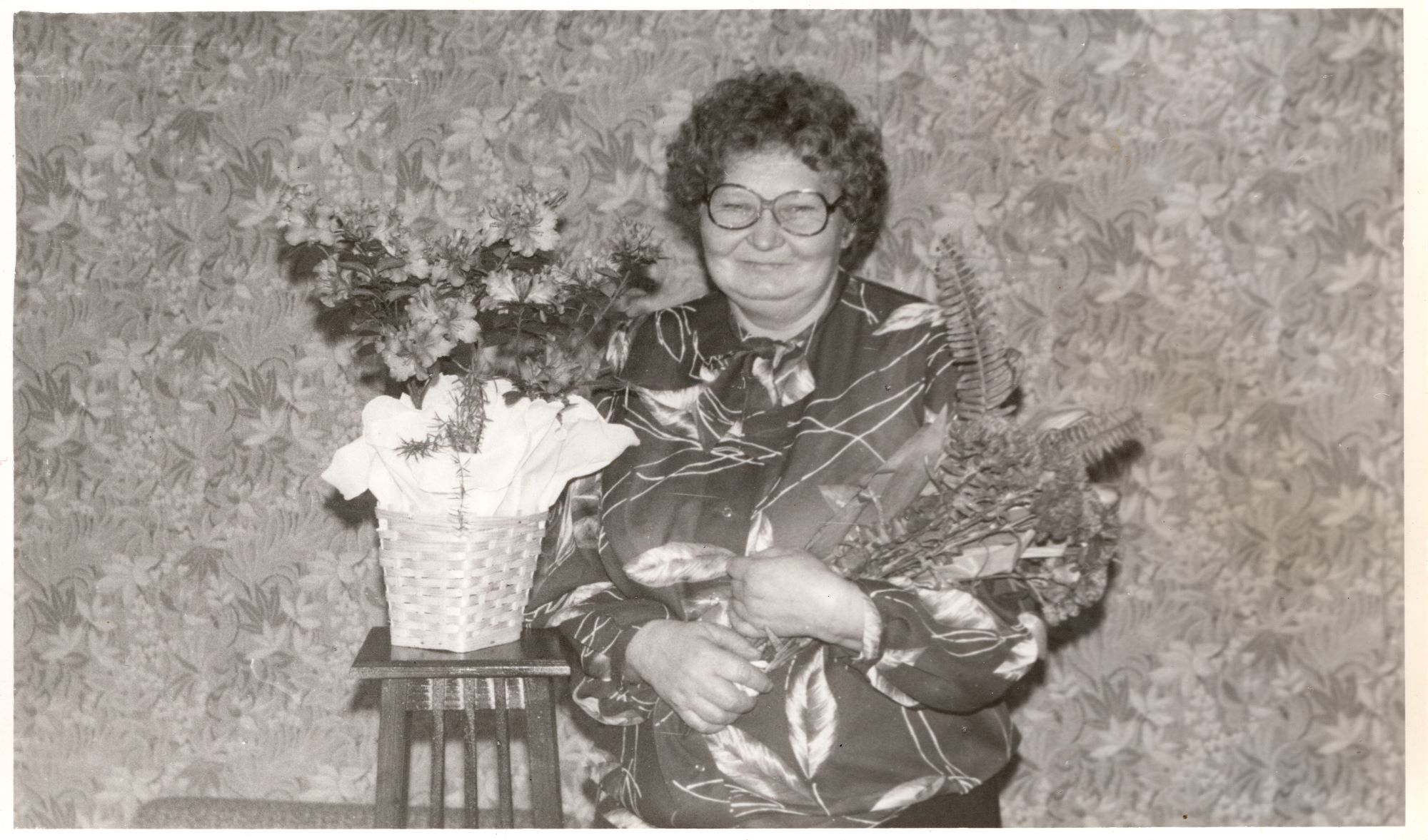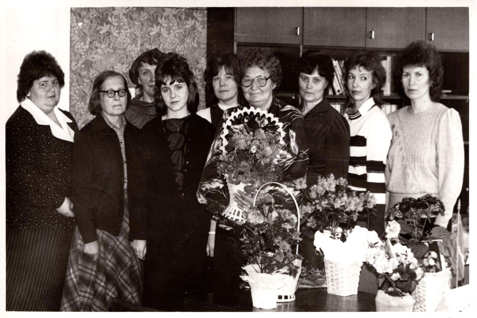Teenindutootmiskoondis "Rapla" pearaamatupidaja Meeri Kärme juubelipeo pildid. Aasta ilmselt 1984. Õnnitlemas kontoritöötajad Raplast ja Märjamaalt.