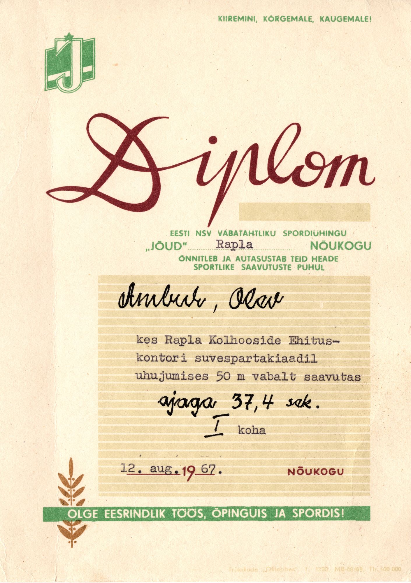 Diplom saadud Rapla Kolhooside Ehituskontori suvespartakiaadil 1967. a. Olev Ambur I koht 50 m vabalt ujumises.