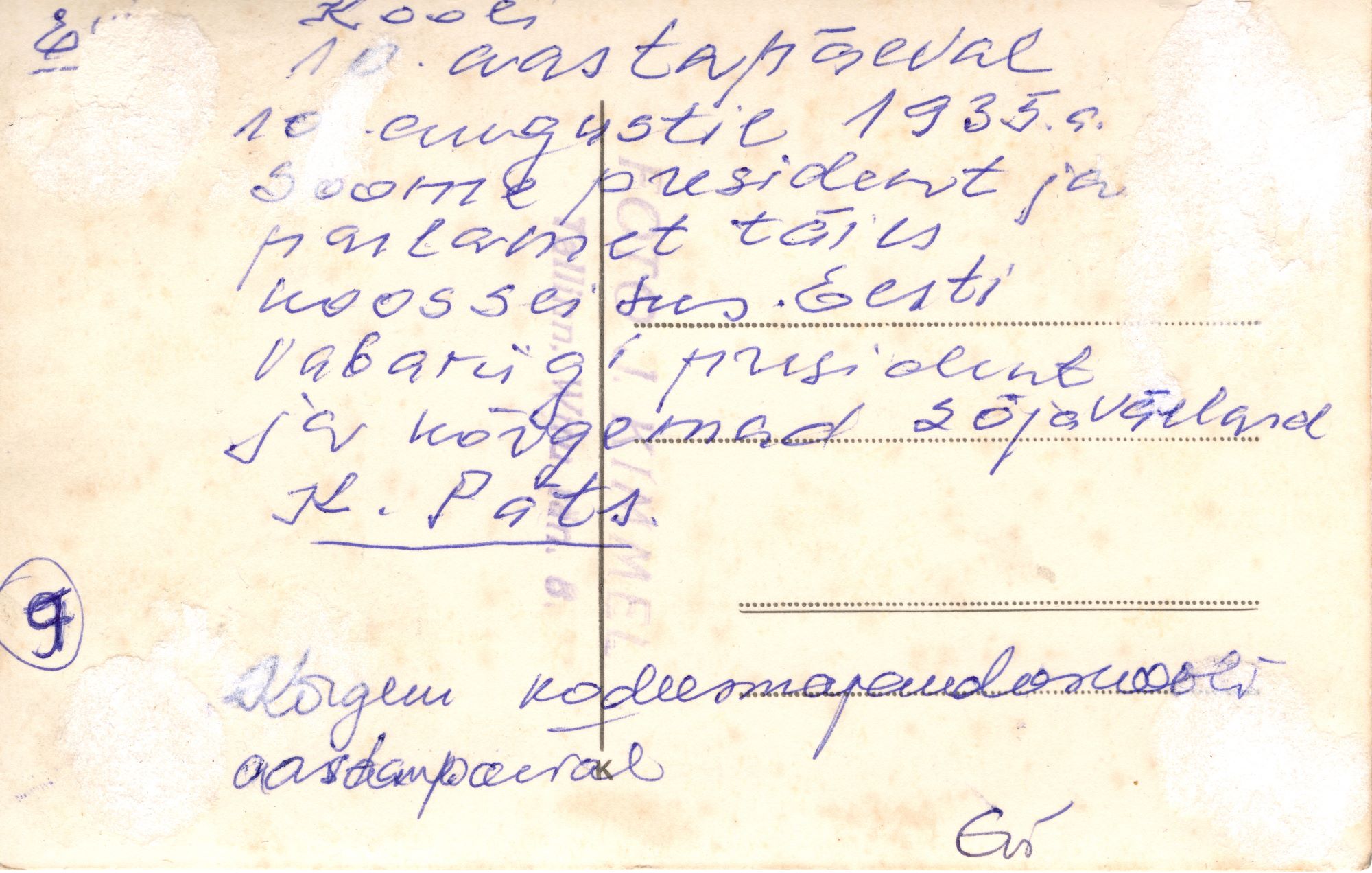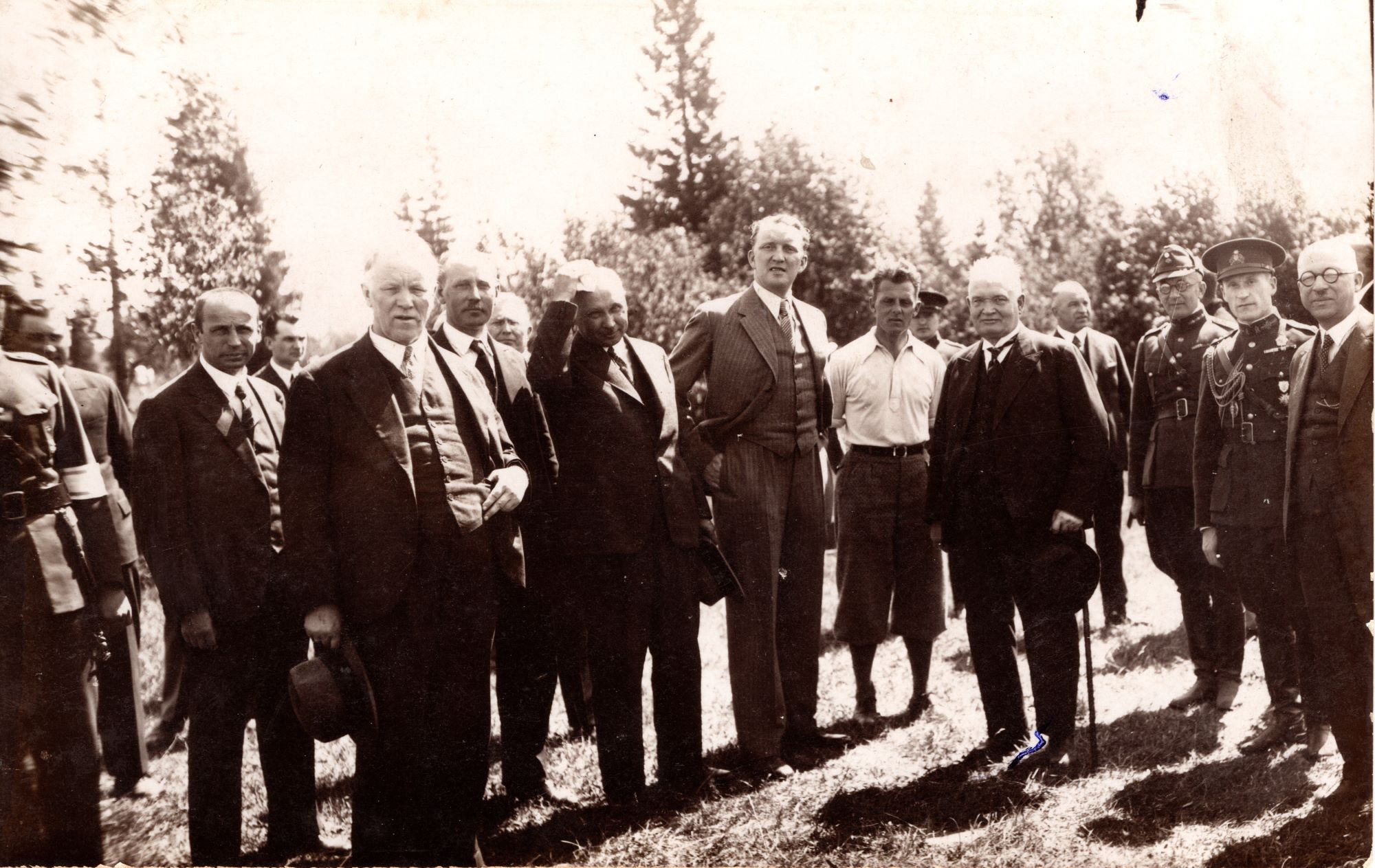 Fotol külalised Soomest Kehtna Kõrgema Kodumajanduskooli 10. aastapäeval 10. augustil 1935. Fotol vasakult kolmas (kaabuga) haridusminister Nikolai Kann, siseminister Kaarel August Eenpalu. Keskmine pikk mees majandusminister Karl Selter, kepi ja kaabuga peaminister riigivanema ülesannetes Konstantin Päts. Paremalt esimene välisminister Julius Seljamaa, tema kõrval paraadvormis