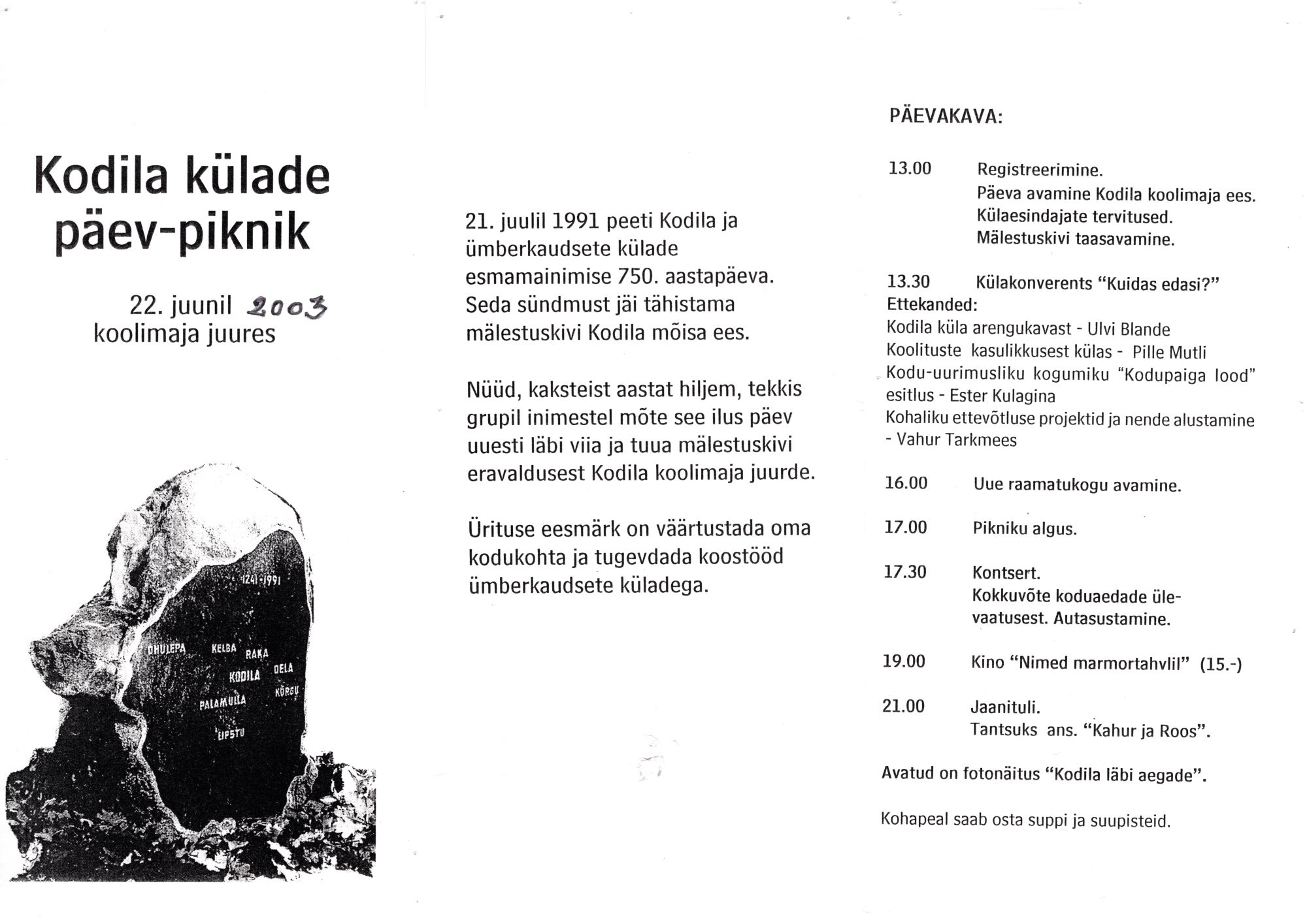 Kodila külakonverents "Kuidas edasi?" toimus 22.06.2003 Kodila koolimajas Kodila külade päev-pikniku raames. Esinesid Ulvi Blande, Pille Mutli, Ester Kulagina, Vahur Tarkmees.