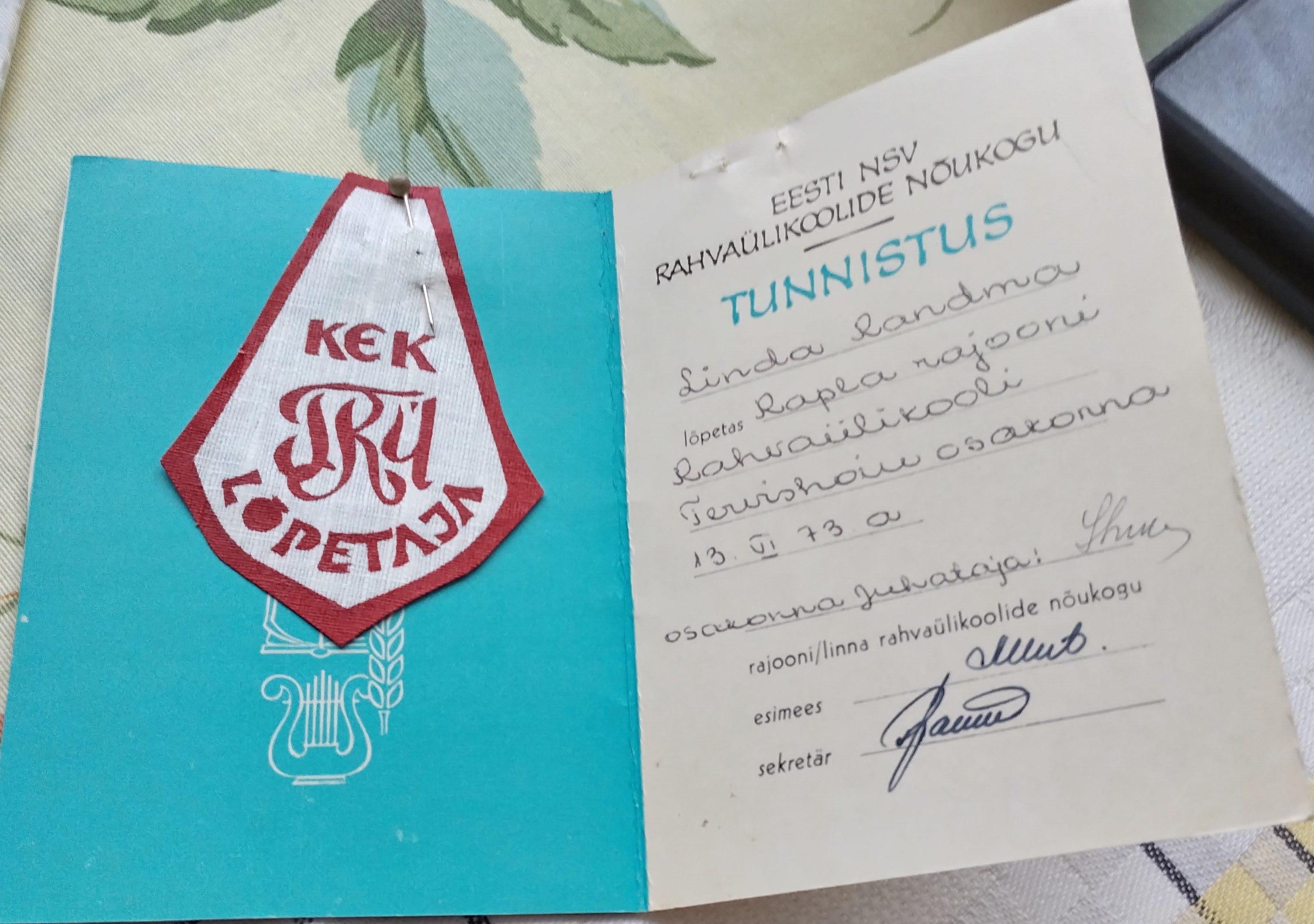 Rahvaülikooli tunnistus aastast 1973, antud Linda Randmaale.