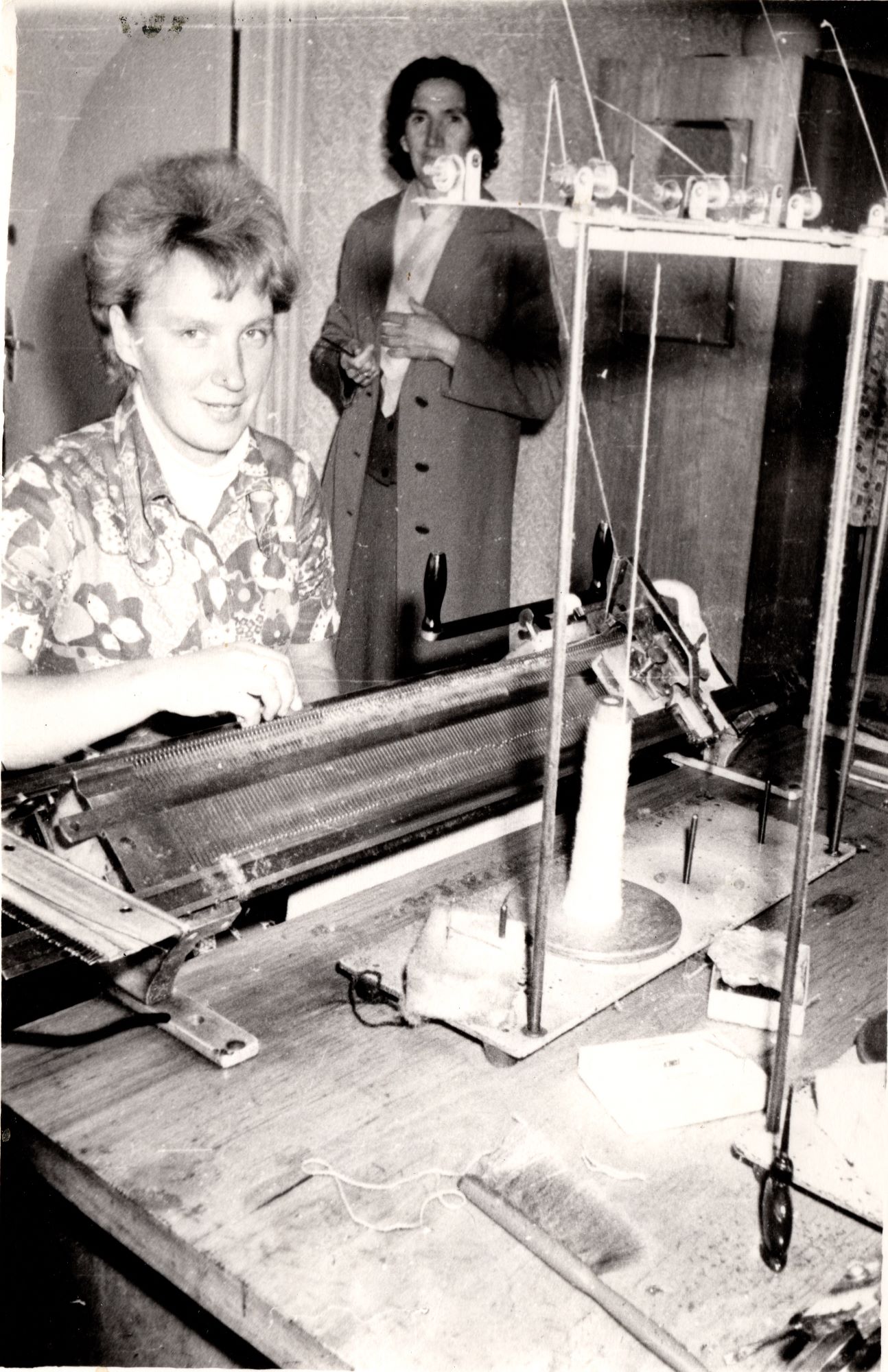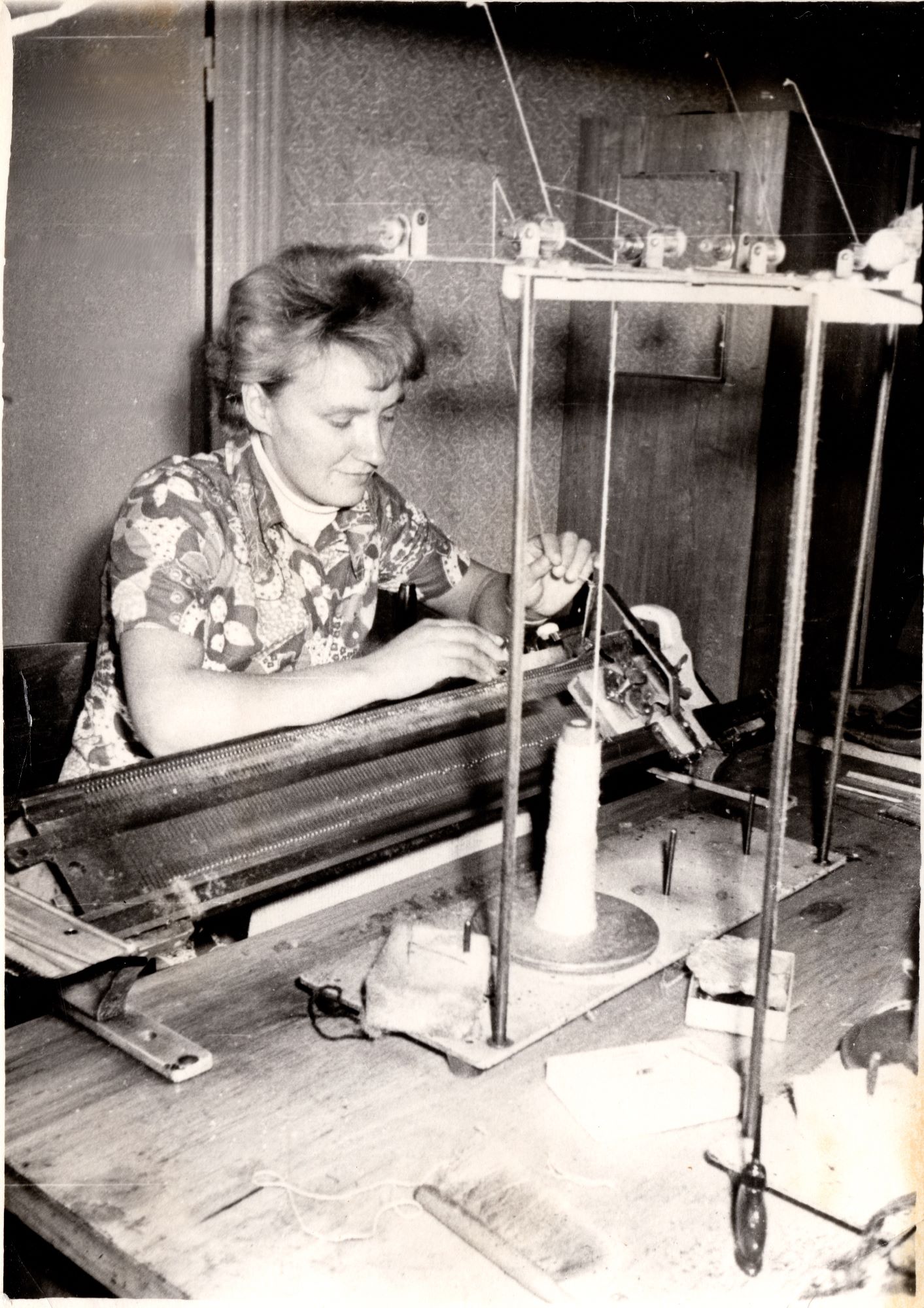 Helle Prints töötamas kudumismasina taga. Aeg arvatavasti 1970ndatel.