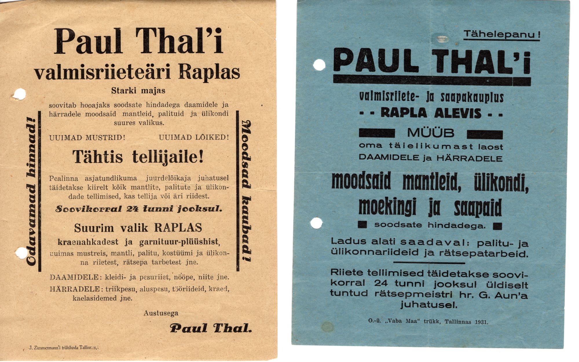 | dc.description | Paul Thal' i valmisriieteäri reklaamid Raplas 1930ndatel. | et_EE |