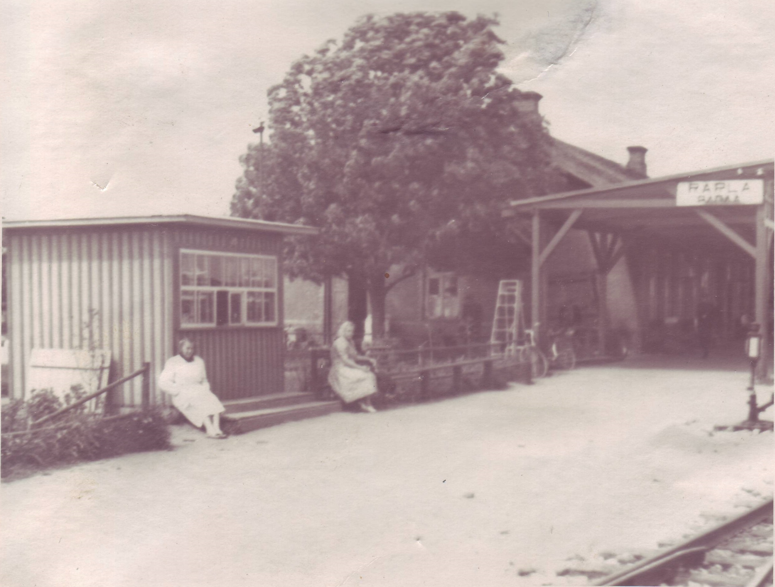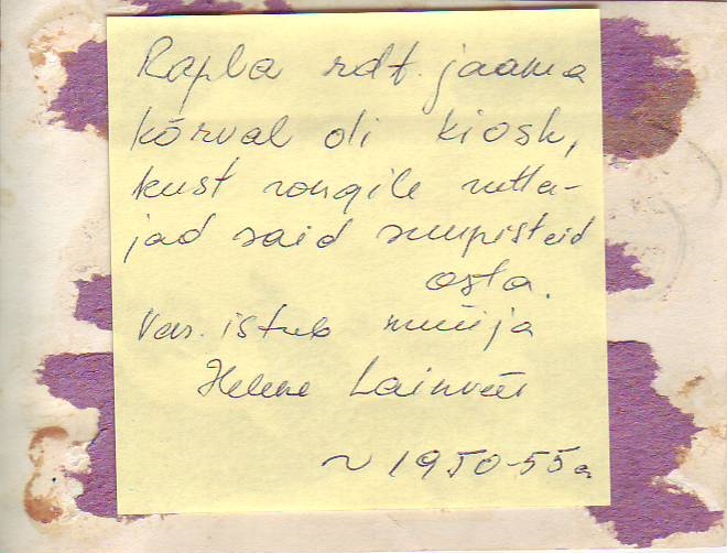 Rapla raudteejaama kiosk, kust reisijad said suupisteid osta. Foto tagaküljel selgitav tekst.